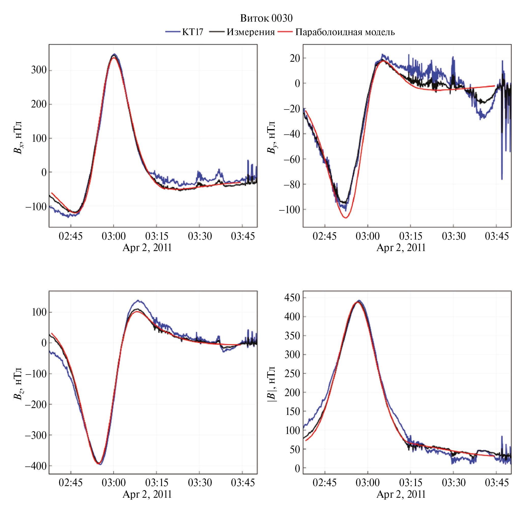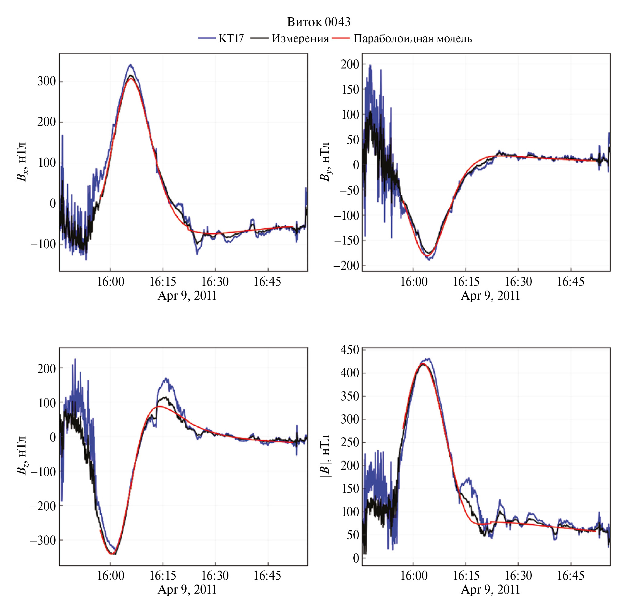 На рис. 4, 5, 6 показаны экспериментальные данные и модельные результаты, полученные после определения оптимальных параметров, для трех компонент и суммарного вектора магнитного поля. Показаны как результаты обработки при помощи параболоидной модели, так и результаты KT17.
