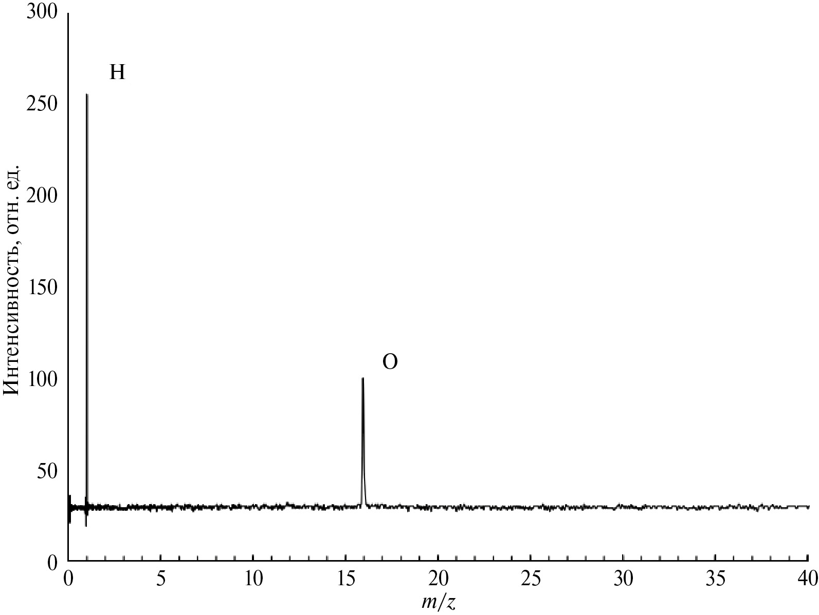 На начальном этапе, при максимальной энергии лазера 15–17 мДж в массовых спектрах ледовой матрицы наблюдалась сильная перегрузка, вызванная избыточной плотностью мощности лазерного излучения вплоть до получения многократно ионизованных массовых пиков кислорода. При уменьшении энергии лазерного излучения до 9–10 мДж были зарегистрированы спектры, в которых присутствовали только массовые пики водорода и кислорода (рис. 2). При первом выстреле лазера, в отличие от второго выстрела в двухимпульсном режиме, наряду с пиками кислорода и водорода всегда присутствовал углерод, что может быть объяснено конденсацией паров масел на поверхность ледяной капли в вакуумной камере. Наличие углерода в первом спектре и его отсутствие во втором демонстрирует, что поверхность льда в ходе эксперимента полностью очищалась от конденсирующихся на ней веществ первым импульсом лазера. Таким образом, второй импульс лазерного излучения взаимодействовал непосредственно с ледяной матрицей.