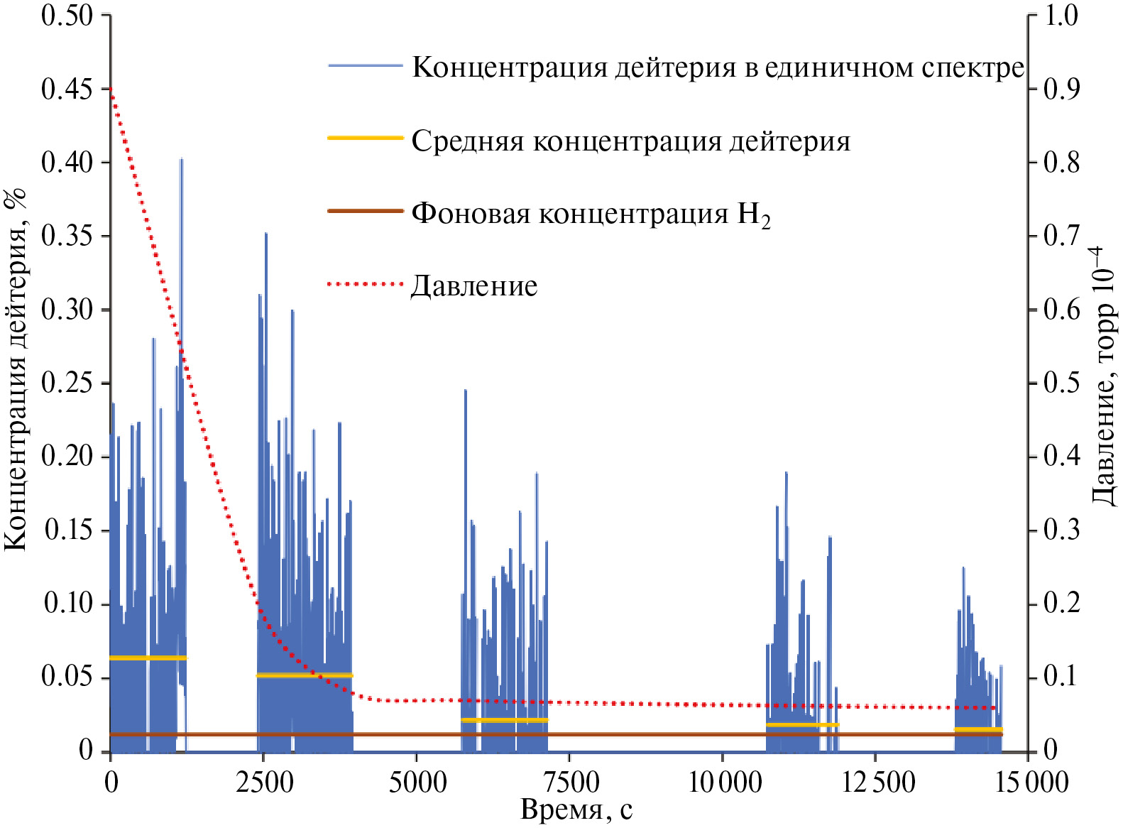 В контрольных экспериментах при анализе образцов порошка Fe3O4 и JSC-1, увлажненных только H2O (без внесения дейтерия), фоновая концентрация H2 составила 0.012% (рис. 6). Вероятно, ионы H2+ образовывались в плазменном факеле при разрушении атомов воды, а также в результате синтеза из атомов водорода, воды и/или масел, содержащихся в вакуумной системе. В условиях космического эксперимента вакуумная система и соответствующие загрязнения будут отсутствовать, что должно улучшить предел обнаружения водорода.
