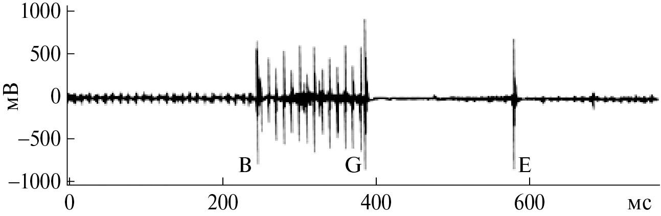 Анализ показал, что импульс имеет широкополосную составляющую от 1 до 10 кГц, с двумя большими пиками около 1.5 и 2.5 кГц. Точки В и Е указывают начало и конец сигнала. В точке G активировалась автоматическая регулировка усиления видеокамеры. Интервал времени от B до E составляет около 1/3 с.