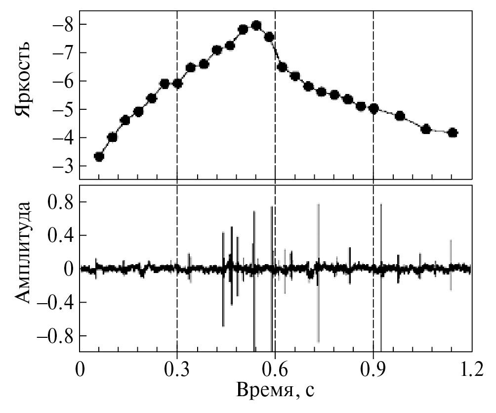 Рис. 2. Записанное ELF-/VLF-излучение от метеора с визуальной величиной –8m ± 0.5m. Верхний рисунок – это записанное видео показывает яркость метеора, а нижний это – запись сигнала в ELF-/VLF-канале во время этого события (амплитуда дается в условных единицах). Точность синхронизации между видео- и ELF-/VLF-каналами ±0.02 с.