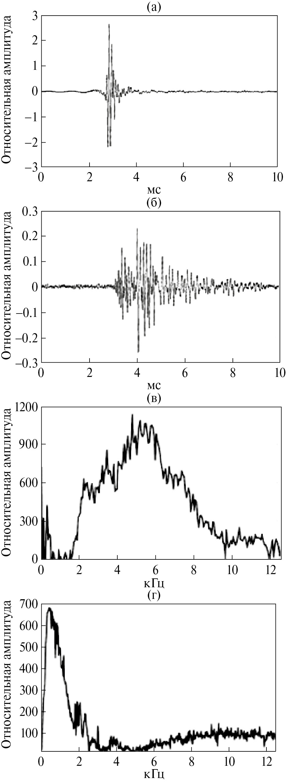 Рис. 3. Радиоимпульсы и спектры от метеороида и от молнии: (а) – разряд молнии; (б) – импульс от метеора; (в) – спектр от молнии; (г) – спектр от метеора.