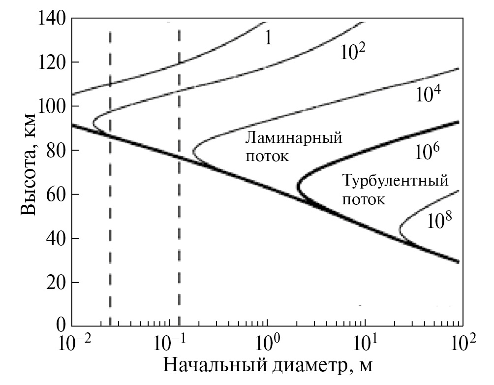 Рис. 4. Рассчитанные числа Рейнольдса как функцииначального диаметра метеора и высоты. Сплошные линии соответствуют постоянным числам Рейнольдса, значения которых нанесены на график. Жирная линия отделяет область ламинарного течения (Re < 106) от области турбулентного течения (Re > 106). Пунктирные вертикальные линии соответствуют электрофоническим метеорам, зарегистрированным в данной экспедиции. Расчеты были выполнены для зенитного угла zr = 0°.