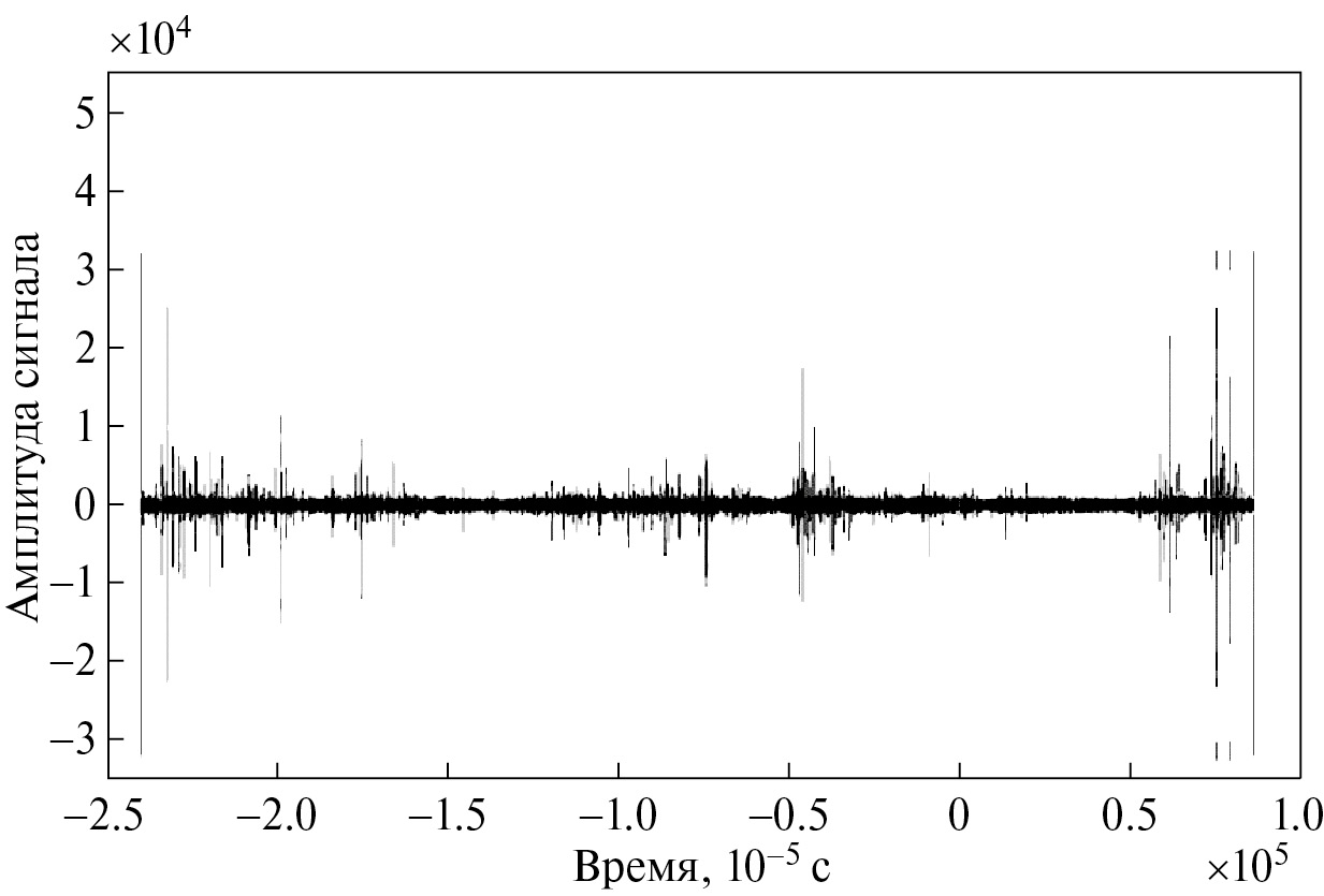 Продолжительность типичной кривой блеска метеора, обнаруженного системой наблюдений, колеблется от 0.2 с до 1 с, а исключительно длинные – до 3.6 с. Из наблюдаемых данных следует, что при исследованиях случайных временных окон было найдено, что, как правило, AWESOME обнаруживает 4.5 импульсов в секунду. Фактическая скорость обнаружения хотя бы одного сигнала молнии во временном окне кривой блеска метеора составляет приблизительно 87.5%. На рис. 5 показана совокупность импульсов от одного события 23.08.2017 г., для которого была корреляция со временем и с направлением на метеор. Все остальные пики аналогичной или большей величины в пределах продолжительности кривой блеска не соответствуют направлению на метеор.