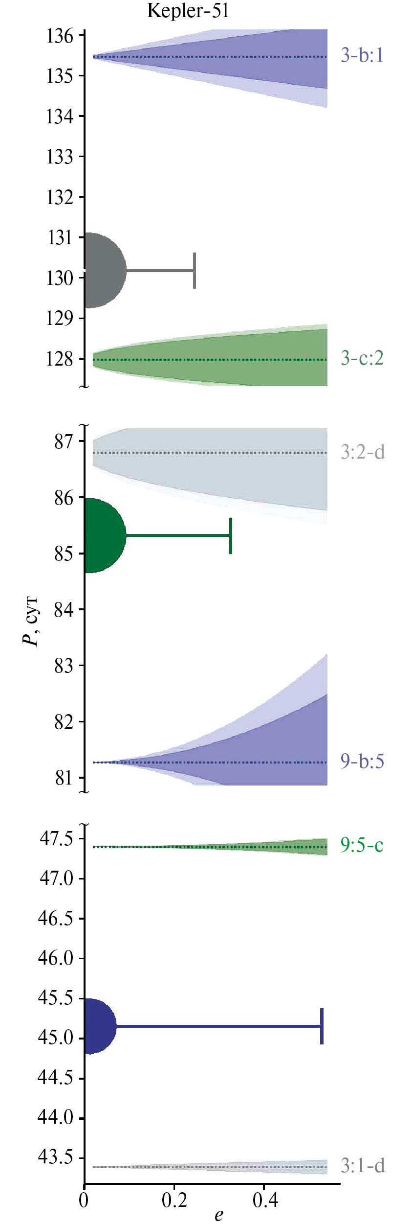 Из рис. 1 следует, что для обновленных значений масс планет и эксцентриситетов их орбит (максимальные значения эксцентриситетов орбит планет b, c и d составляют 0.086, 0.074 и 0.059 соответственно) в системе Kepler-51 резонансы низких порядков отсутствуют.