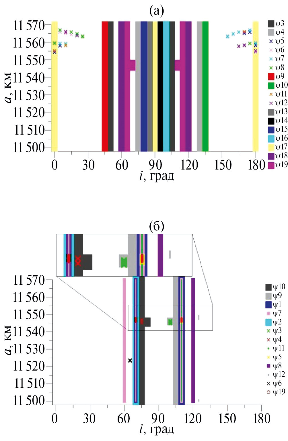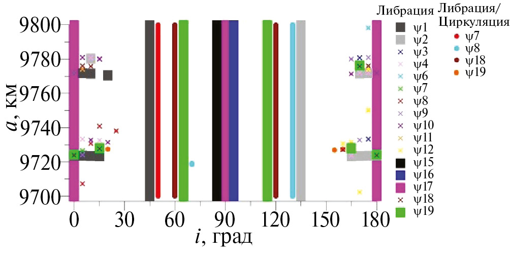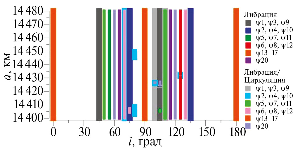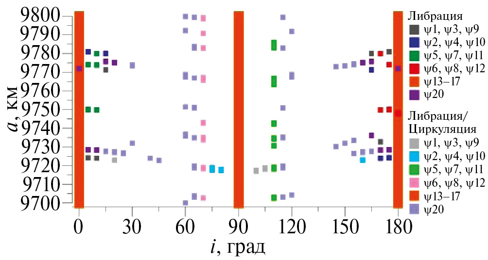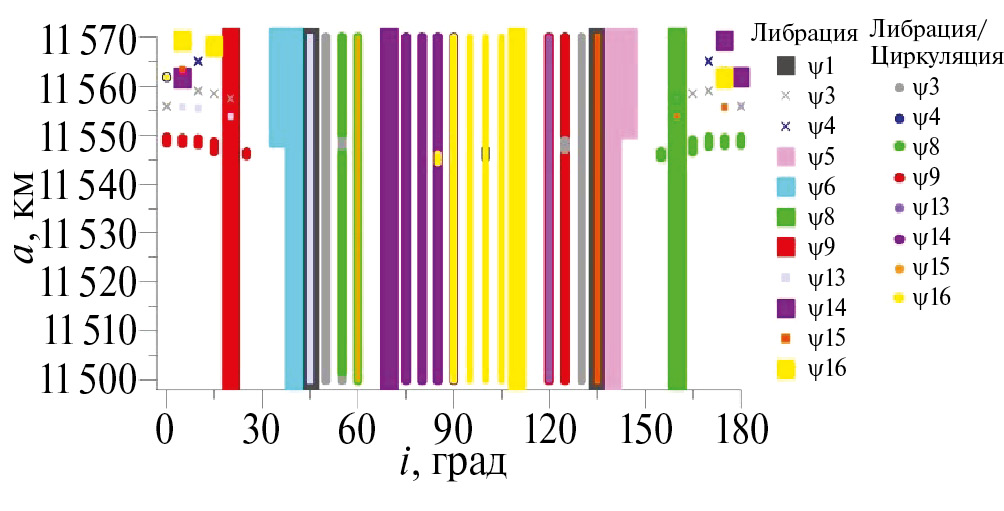 Наиболее загруженной резонансами зоной является область при наклонениях 70° и 110°. В этой зоне действуют как устойчивые, так и неустойчивые резонансы. Кроме того, в области от 11540 км до 11570 км по большой полуоси, начинают проявляться точечные резонансы, которые не пронизывают всю рассмотренную область. Причем при наклонениях от 0° до 30° и от 150° до 180° появляются только устойчивые резонансы, а при наклонениях от 60° до 115° – в основном неустойчивые резонансы.