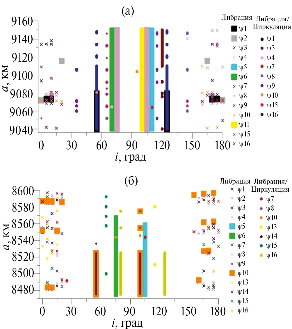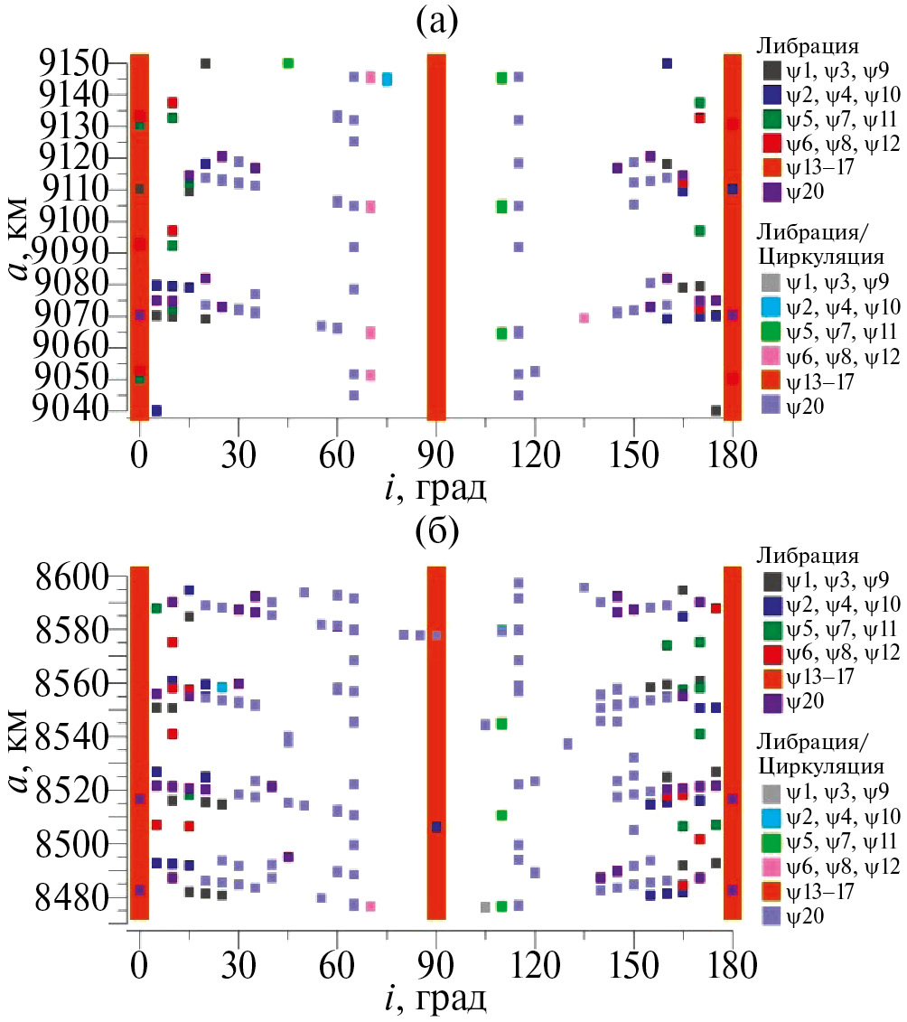 Кроме того, при исследовании динамики объектов, населяющих рассматриваемые области, нами учитывались результаты анализа орбитальных резонансов 1:5, 1:7, 1:9, 1:10 и 1:11 со скоростью вращения Земли, подробно исследованные в работе (Блинкова, Бордовицына, 2022).