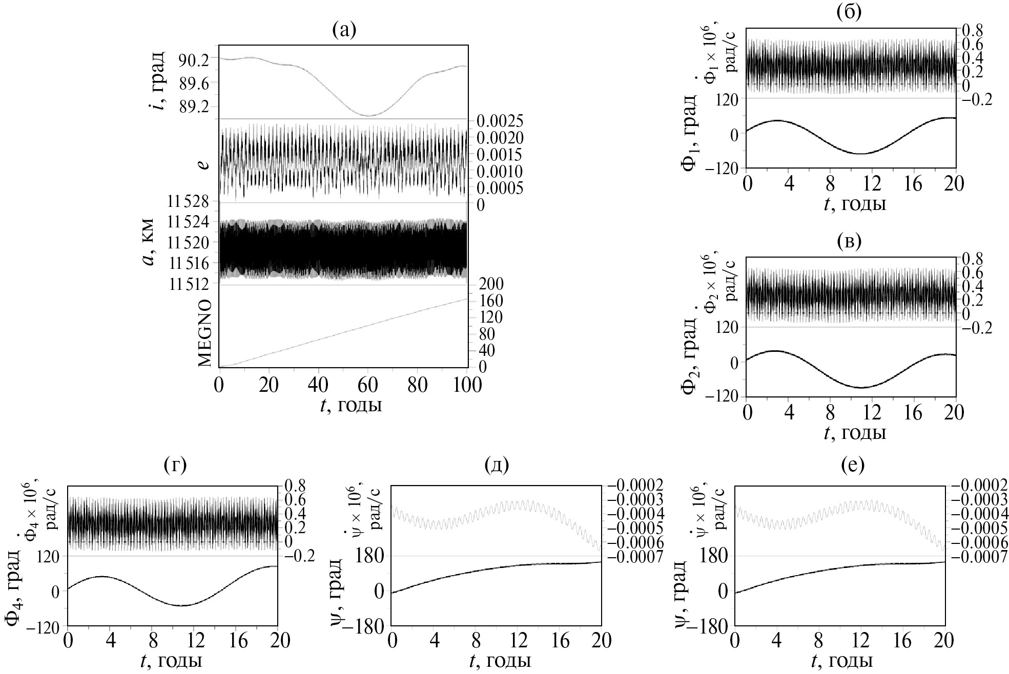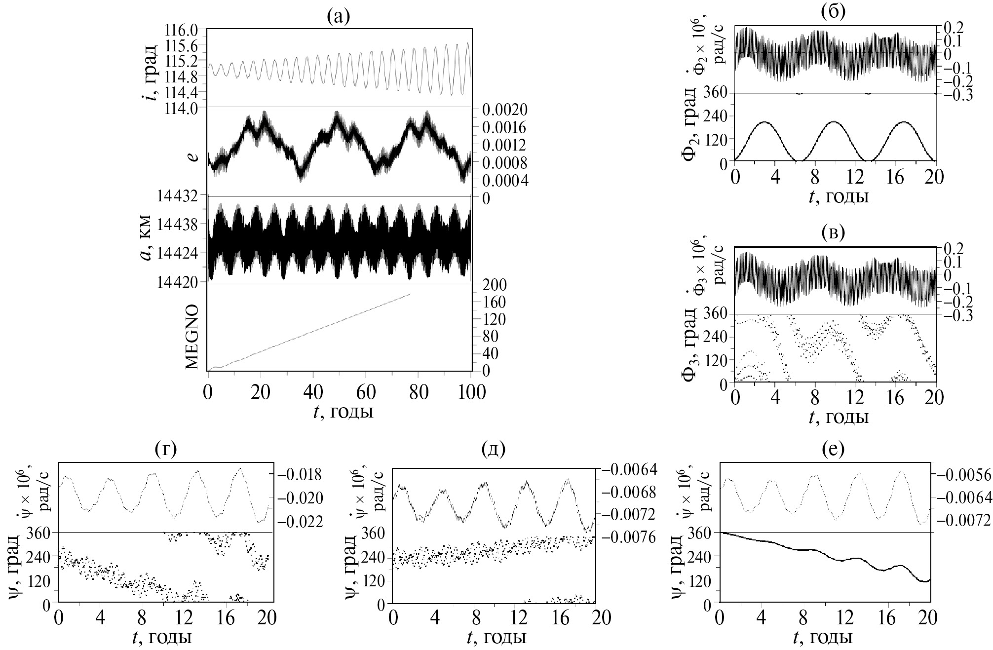 Рис. 18. Особенности динамики модельного объекта, движущегося в области орбитального резонанса 1:5: (а) – эволюция элементов орбиты объекта; (б) – резонансные характеристики (в) – резонансные характеристики (г) – резонансные характеристики , (д) – резонансные характеристики (е) – резонансные характеристики