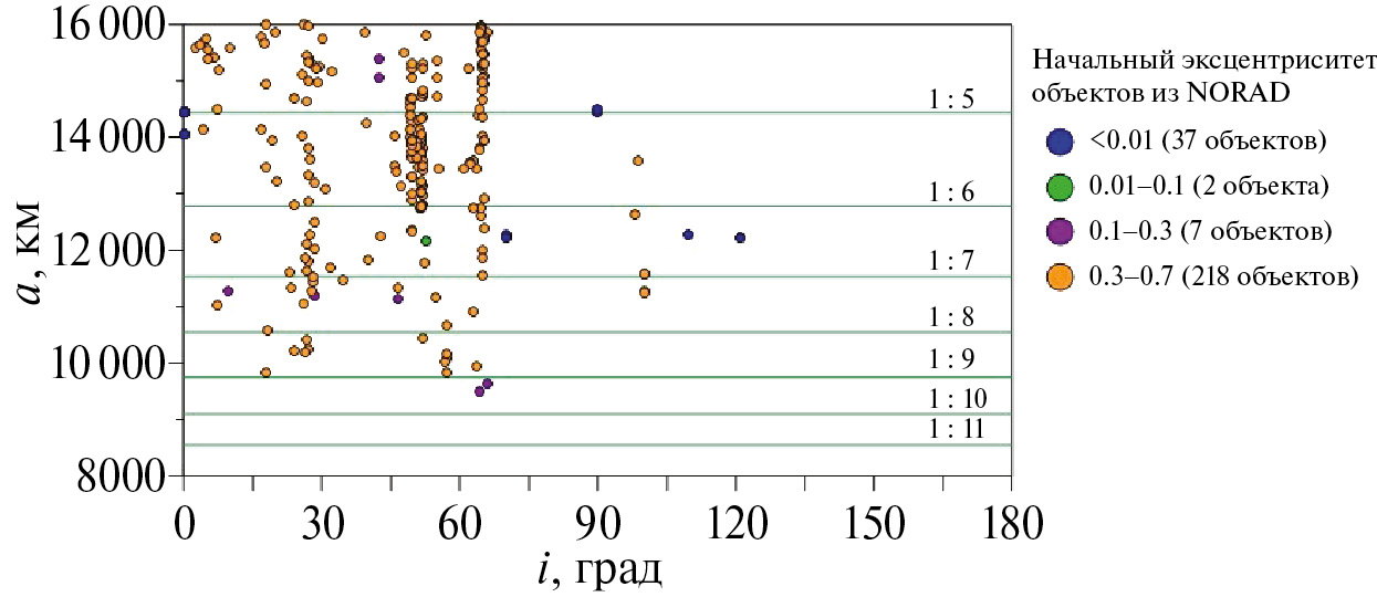 На рис. 24 цветными кружками показано начальное положение объектов из каталога NORAD. Распределение значений эксцентриситетов по цвету дано в легенде справа от рисунка. Кроме того, на рис. 24 выделены области действия орбитальных резонансов со скоростью вращения Земли. Помимо орбитальных резонансов, как было показано выше, в данной области действуют различные вековые и полувековые резонансы.