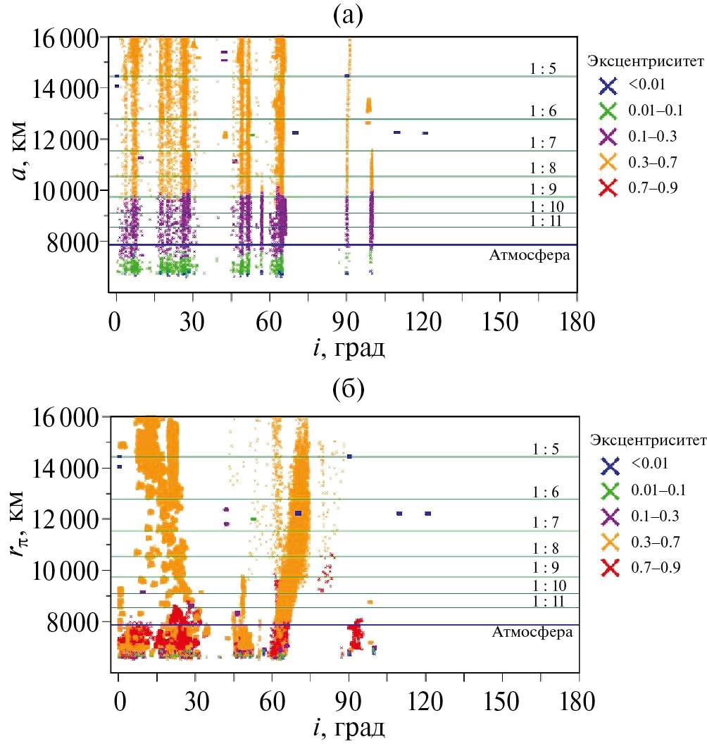 Далее для демонстрации технической загруженности области была промоделирована орбитальная эволюция всех реальных объектов рассматриваемой зоны на столетнем интервале времени. Изменение положения объектов, попадающих в рассматриваемую область, в плоскости “большая полуось – наклонение” показано на рис. 25а цветными крестиками (цвет крестика соответствует значению эксцентриситета из легенды). Здесь следует отметить, что у объектов, расположенных на эллиптичных орбитах, с течением времени наблюдается уменьшение большой полуоси и эксцентриситета орбиты. Это происходит из-за того, что перигей этих объектов изначально находится в области действия атмосферы, что подтверждается данными на рис. 25б. В то же время орбиты объектов с почти круговым движением практически не меняются.