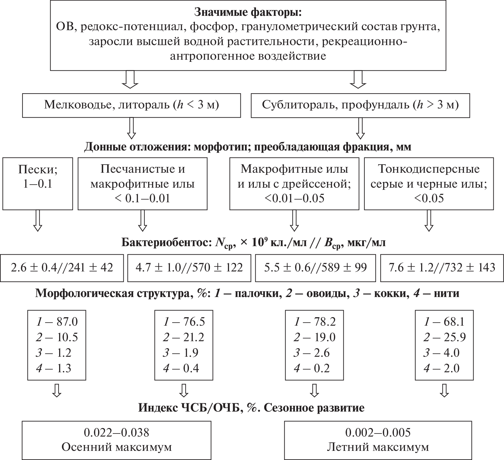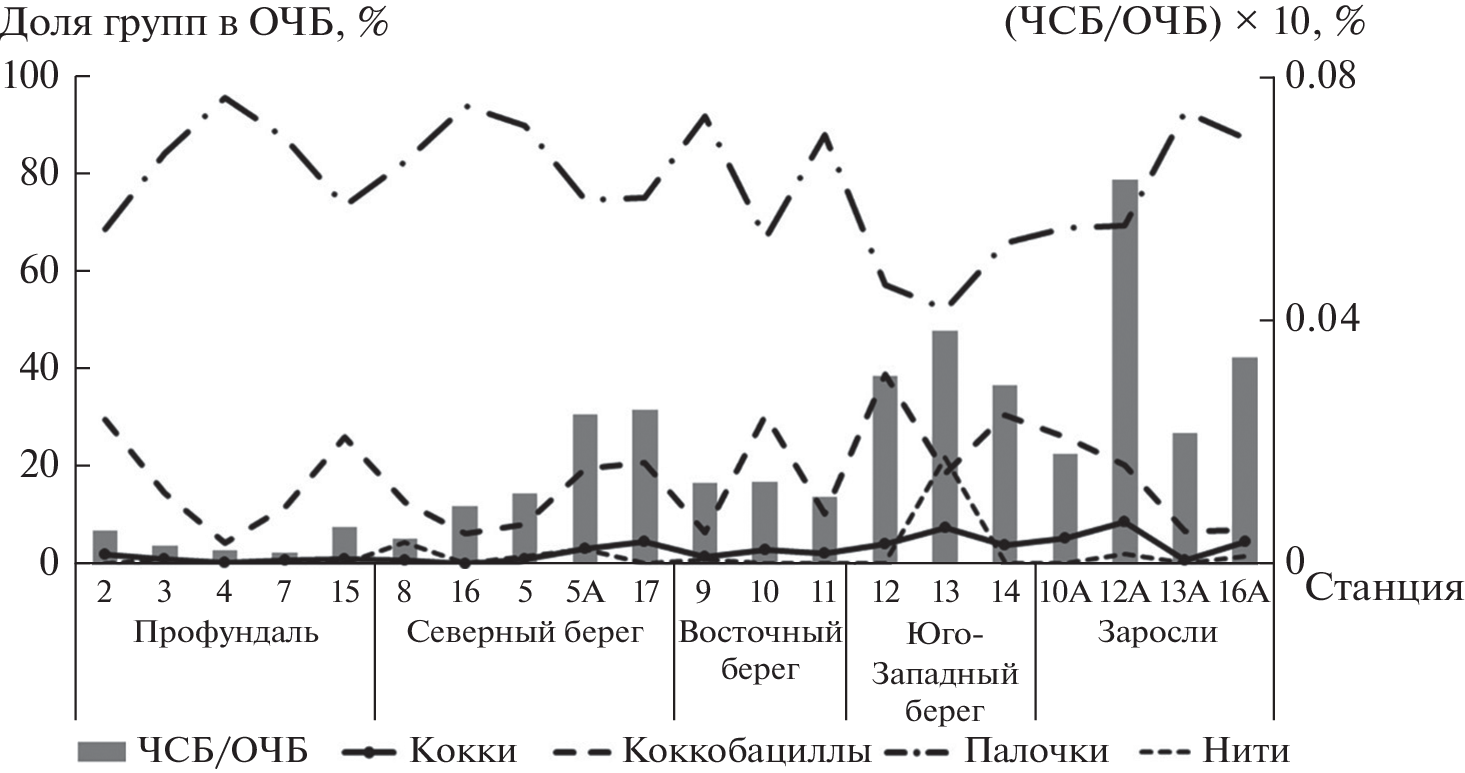 For the first time general quantitative (number, biomass) and structural (morphological, dimensional) indicators of bacteriobenthos in different morphotypes of bottom sediments of the lake Kandry-Kul (Republic of Bashkortostan) were determined. The total number of bacteria was 1.8–11.8 × 109 cl./ml, and the biomass was 106–1344 mcg/mL. Two types of seasonal dynamics of abundance and biomass of deep-wate and coastal bacteriobenthic communities were identified. The influence of heterogeneity of bottom sediments on quantitative indicators and morphological structure of lake bacteriobenthos is considered. The increase in pelitic and aleritic fractions in the mechanical composition of silts contributes to an increase in the total number of bacteria and the restructuring of the morphological structure of bacteriobenthos towards an increase in the number of coccous forms. The proportion of cocci increases with an increase in the percentage of saprophytes in the total number of bacteria.