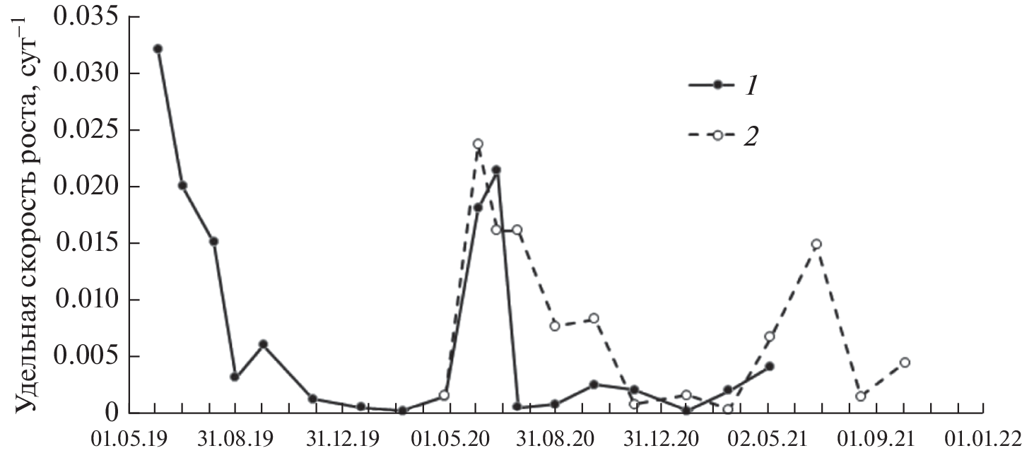 The growth and production of glacial relic amphipods Monoporeia affinis (Lindström, 1855) in a small subarctic lake were studied based on detailed seasonal observations in 2019–2021. Growth and production were closely related to trophic conditions (chlorophyll a concentration). The maximum values were observed at low water temperatures (~5°C) in early summer, coinciding with the spring maximum of chlorophyll. The summer warming of bottom waters was accompanied by a decrease in the growth rate of amphipods, which is apparently associated with the consumption of most of the primary production in the pelagic zone. It is concluded that current climatic conditions can adversely affect glacial relicts even in cold-water lakes of the subarctic zone.