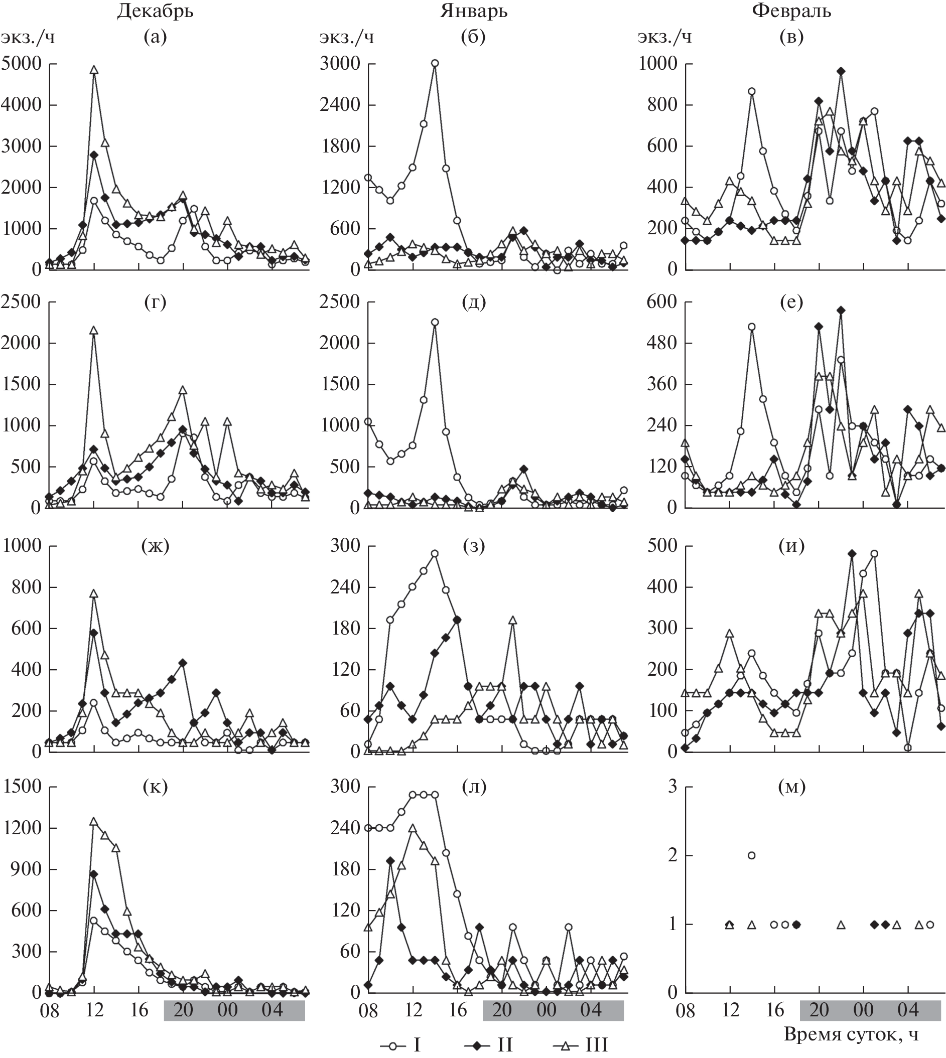 The composition of the winter syrton of a small salmon river was dominated by mayfly larvae (Ephemeroptera), dipteran larvae (Diptera), and adult water mites (Hydracarina). The presence of a significant linear dependence of the number of drifters entering the nets on the volume of water filtered by the nets has not been proven, so we used not the syrton density (ind./m3), but the data of actual catches. The vertical distribution of drifting invertebrates of different taxonomic affiliation had its own characteristics. Under conditions of good illumination of the water column, the drift intensity of invertebrates increased in the daytime. This fact is probably indirectly related to the low water temperature, which limits the swimming ability of drift-feeding fish, which because of this become more vulnerable to fish-feeding warm-blooded predators, and therefore in winter during daylight hours lead a predominantly inactive and secretive way of life. In December, most daytime drifters migrated near the surface of the water column, and in January, on the contrary, near the bottom. The latter may be due to the overwhelming effect of lower daytime air temperatures, since until mid-February the riverbed was not completely covered with ice. After a heavy February snowfall, the upper layers of the river flow turned out to be isolated from the effect of air temperature, and the level of illumination of the water column during the day began to correspond to the period of late twilight. As a result, fish became less accessible to warm-blooded semiaquatic predators, the intensity of invertebrate drift in the daylight hours decreased sharply, and the distribution of drifters throughout the water column vertical became fairly uniform.