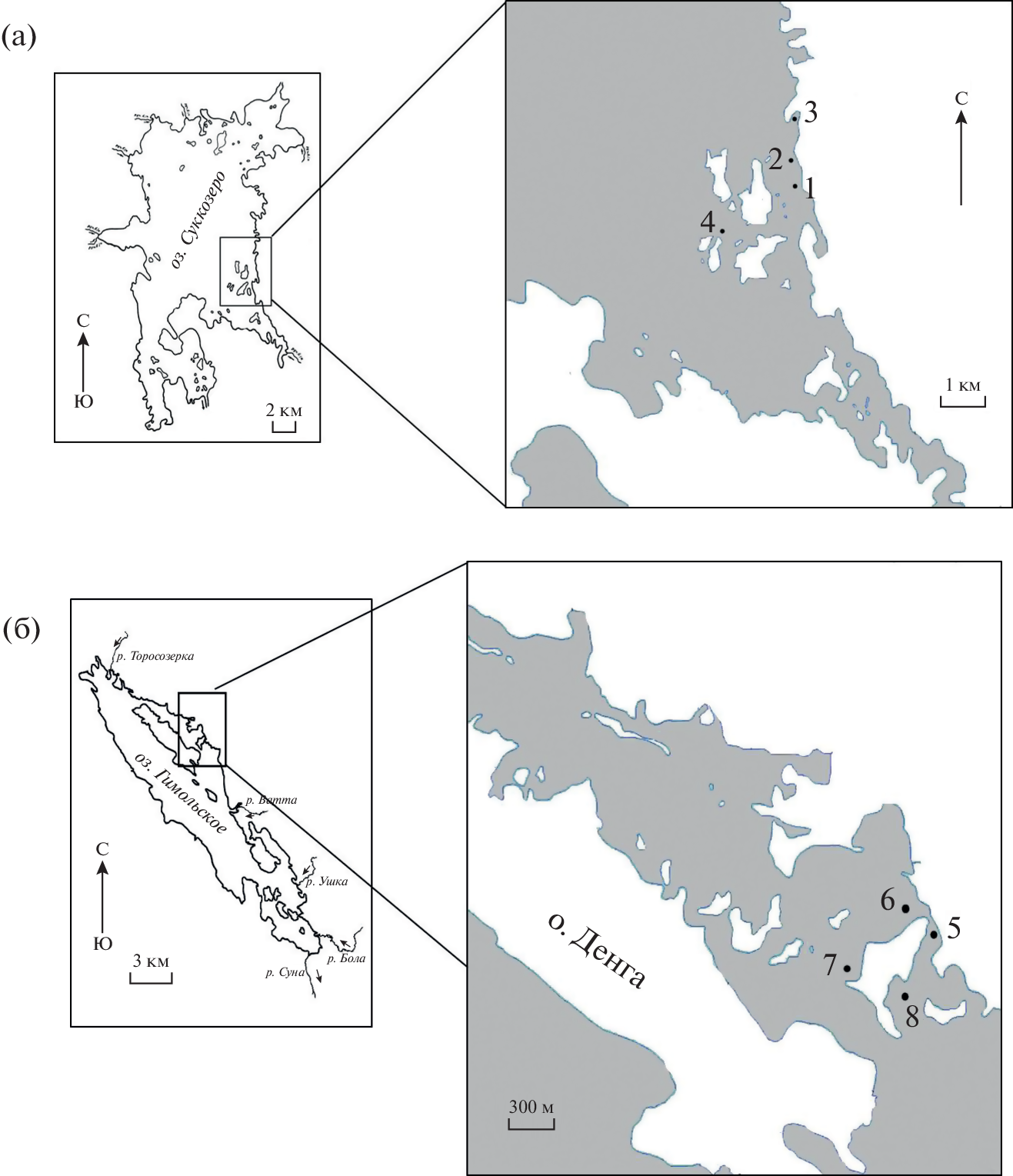 The results of studies of the current state of zoobenthic communities of lakes Sukkozero and Gimolskoye, located in the western part of the Republic of Karelia (Muezersky district), are presented. Under conditions of high color and low mineralization of waters, communities are formed with a predominance of chironomid larvae, caddisflies, mayflies, and oligochaetes. Biomass and abundance indicators in 2017–2018 were within 0.41–0.75 g/m2 and 315–685 ind./m2 in the lake Sukkozero and 0.41–0.93 g/m2 and 220–346 ind./m2 in the lake Gimolskoye. The highest values of abundance and biomass were noted in biotopes of silty soils (overgrown littoral and profundal), the lowest values in the biotope of sandy littoral. According to the level of quantitative development of zoobenthos, Sukkozero belongs to oligotrophic water bodies; Gimolskoye – mesotrophic. The experience of using common biotic indices for assessing the ecological quality of waters (Mayer, oligochaete, saprobity, chironomid) indicates that low mineralization and high humus content can affect their performance and distort the assessment of real organic pollution.
