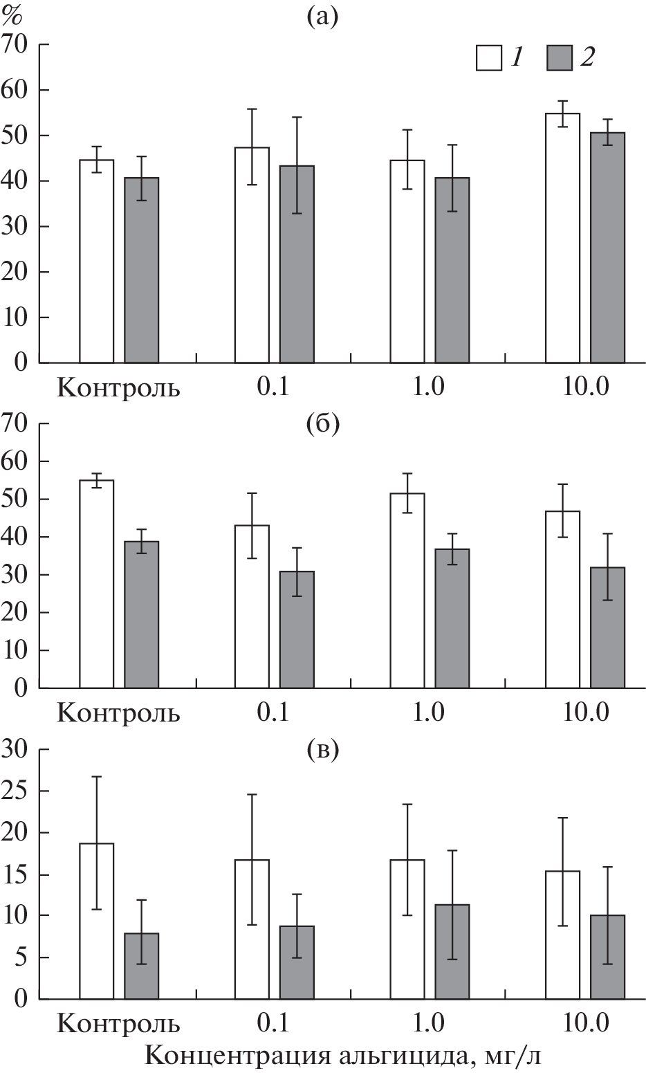 For the first time, the effect of a patented alcoholic solution of algicide on seed germination and the development of seedlings of three species of helophytes Sparganium emersum, S. glomeratum and Schoenoplectus lacustris was studied based on gallic, tetradecanoic, heptane and octane organic acids. Significant differences were found in the effect of different algicide concentrations (0.1, 1.0 and 10.0 mg/L) on seed germination and the initial stages of seedling development of three species of helophytes. We observed the stimulation of germination of Sparganium emersum seeds at a concentration of 10.0 mg/L and inhibition of this process in S. glomeratum at concentrations of 1.0 and 0.1 mg/L. No significant effect of algicide on the germination of Schoenoplectus lacustris seeds was found. According to the degree of increase in the resistance of morphological parameters of plants to the effect of different algicide concentrations, seedlings of three species of helophytes are arranged in the following series: Schoenoplectus lacustris > Sparganium glomeratum > S. emersum.