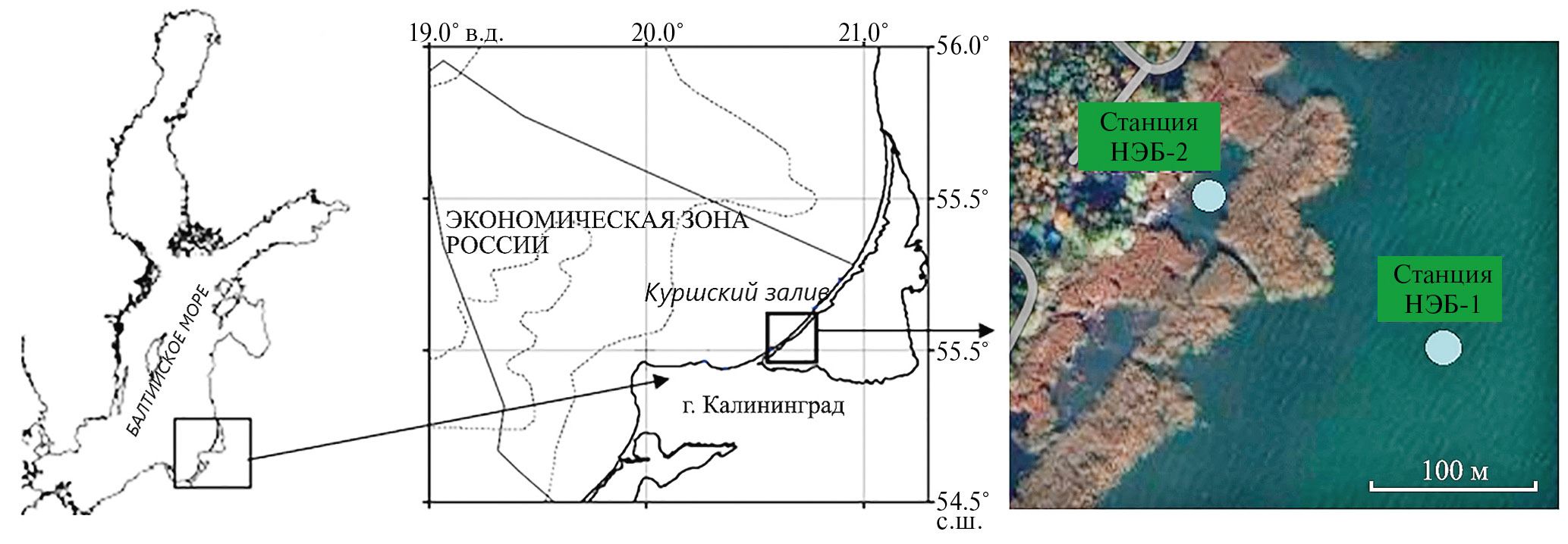 Фитопланктон и зоопланктон изучали в 2017–2021 гг. в прибрежной зоне российской части Куршского залива в районе научно-экспериментальной базы (НЭБ) Атлантического филиала Всероссийского научно-исследовательского института рыбного хозяйства и океанографии. Пробы планктона отбирали ежемесячно с января по декабрь на двух стандартных станциях (рис. 1). Станция НЭБ-1 располагалась в относительно глубоководной части водоема (глубина 3 м) на удалении 500 м от берега за поясом макрофитов, станция НЭБ-2 – в прибрежной мелководной литоральной зоне (глубина 0.5 м), окруженной поясом макрофитов. Пробы фитопланктона объемом 0.5 л консервировали раствором Люголя с добавлением формалина и ледяной уксусной кислоты. Сгущение проб проводили седиментационным методом до 5–20 мл в зависимости от количества фитопланктона в пробе. Количественную обработку выполняли по общепринятой методике в счетной камере типа “Учинская” объемом 0.01 мл при помощи микроскопа Leica DM2500. Объем клеток водорослей для расчета биомассы вычисляли методом геометрического подобия. К доминирующим относили виды, составлявшие ≥ 10% суммарной биомассы (Методика…, 1975). Для оценки степени развития ПТ таксонов принимали один из рекомендованных нормативов ВОЗ — численность клеток всех ПТ таксонов 20 млрд. кл./м3, представляющий угрозу при использовании водоемов в рекреационных целях (WHO, 2004).