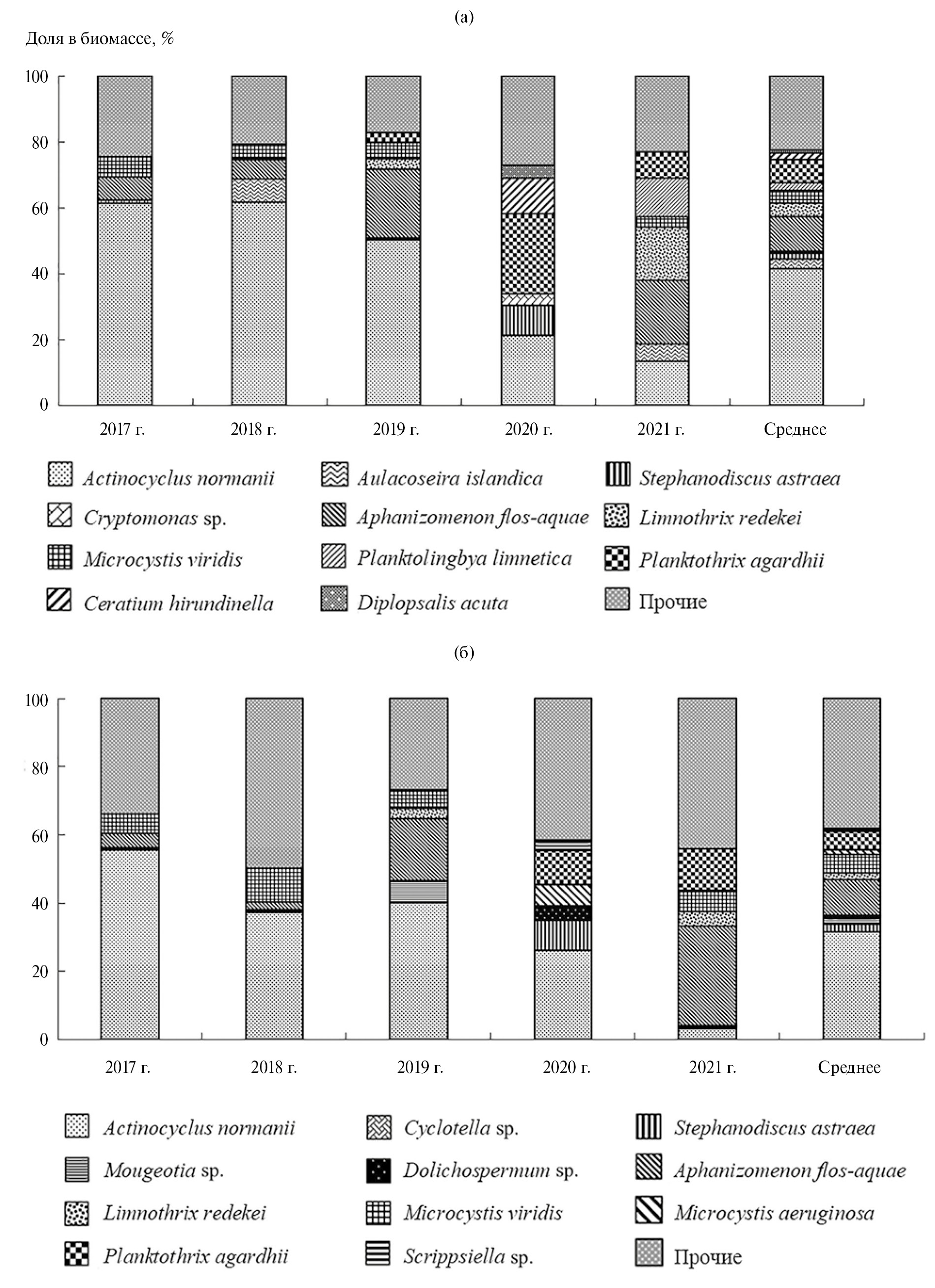 Помимо перечисленных в табл. 1 видов, в составе сообществ также были обнаружены потенциально-токсичные виды рода Microcystis, которые постоянно присутствовали в заливе в летние месяцы 2017–2021 гг., но развивались в меньших количествах. Доля видов рода Microcystis на НЭБ-1 и НЭБ-2 варьировала от 3.2 до 10% (рис. 2). На обеих станциях вклад в биомассу Aphanizomenon flos-aquae в среднем был несколько выше (11%), чем Planktothrix agardhii (5–7%), однако Aphanizomenon flos-aquae полностью отсутствовал в составе сообществ в июле–августе в 2020 г. на фоне возрастания роли Planktothrix agardhii (24%) (рис. 2). Диатомея Actinocyclus normanii была основным доминантом и на ст. НЭБ-1, и на ст. НЭБ-2. Ее доля в биомассе (41%) на ст. НЭБ-1 превышала таковую на ст. НЭБ-2 (32%). Наиболее низкие доли этого вида в биомассе (3–20%) зарегистрированы в 2020 и 2021 гг., наиболее высокие (37–61%) – в 2017–2019 гг. (рис. 2).