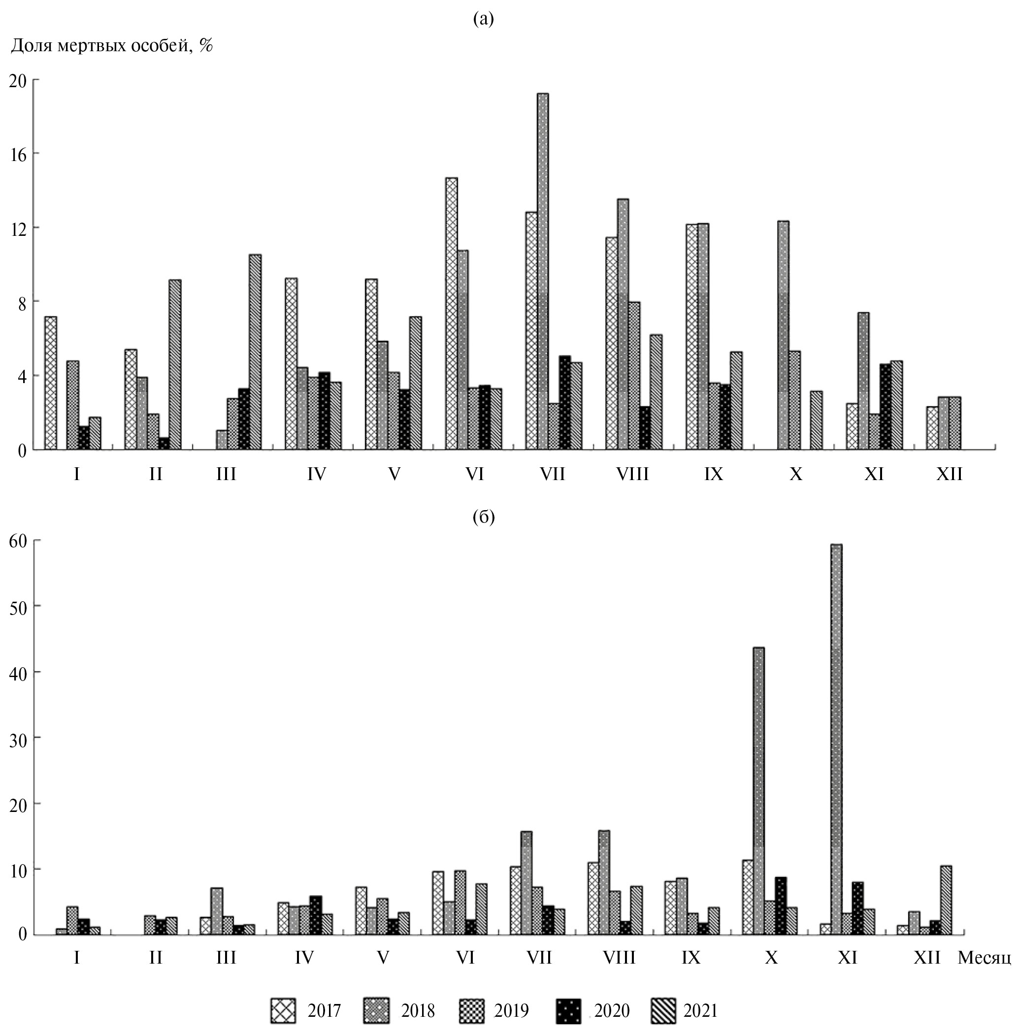 Рис. 9. Доля мертвых особей зоопланктона в Куршском заливе на станциях НЭБ-1 (а) и НЭБ-2 (б) в 2017–2021 гг.