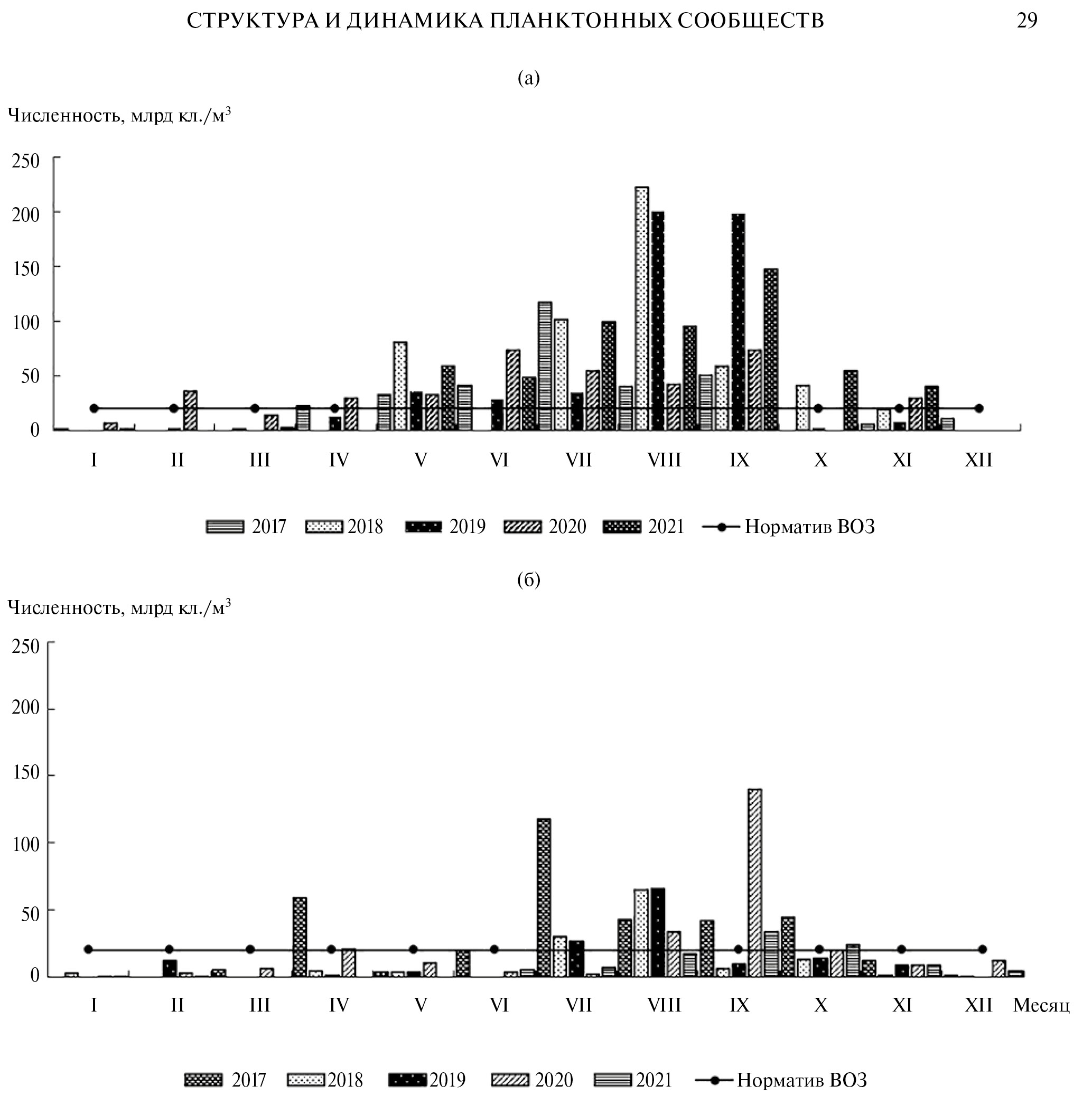 Ежегодно, особенно с мая по сентябрь, численность ПТ таксонов превышала уровень (20 млрд кл/м3), представляющий угрозу при использовании водоемов в рекреационных целях (рис. 5а). Уровень развития ПТ таксонов на ст. НЭБ-2 был существенно ниже и превышал норматив ВОЗ только в апреле, июле, августе и сентябре отдельных лет (рис. 5б).