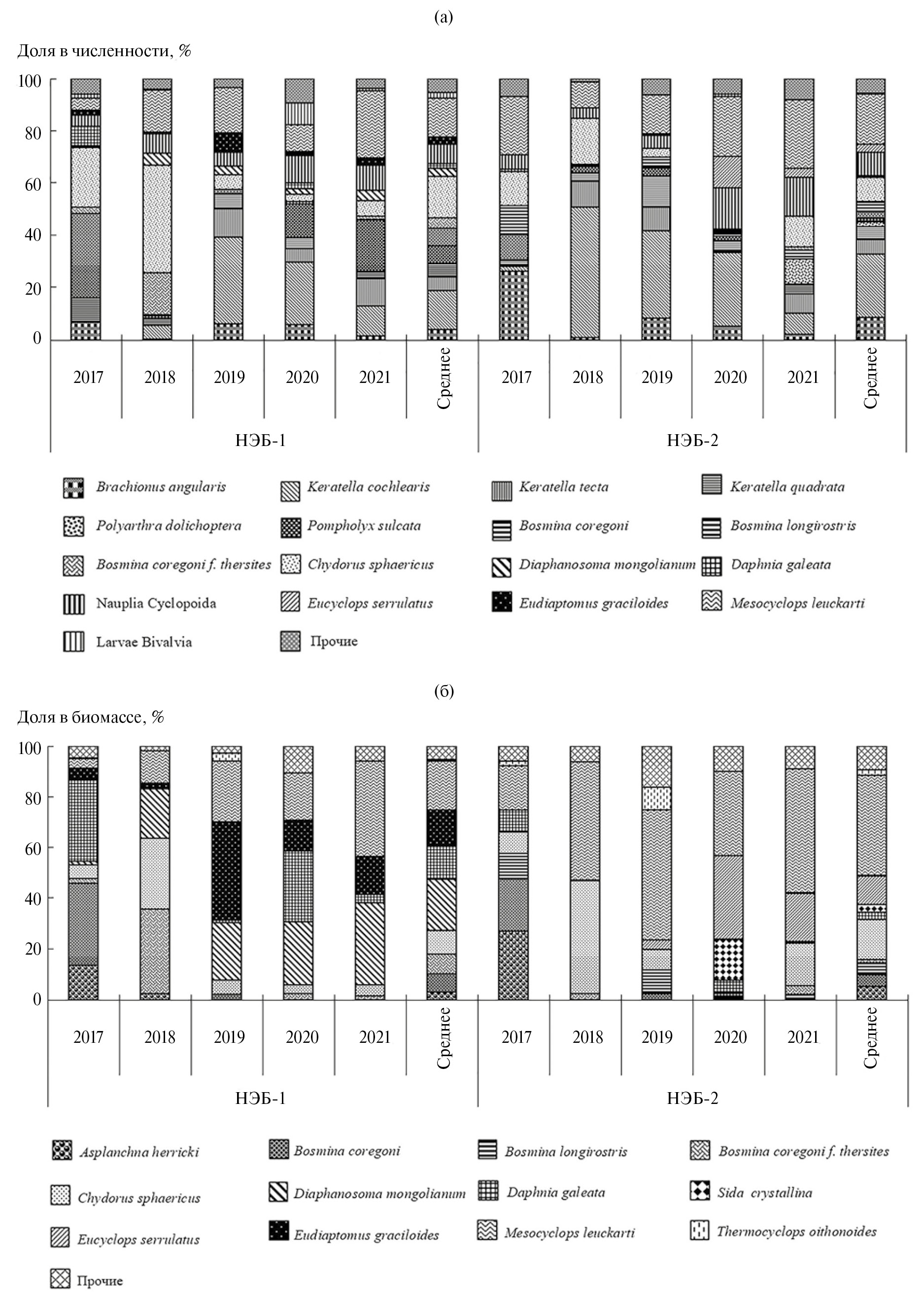 Во все сезоны на обеих станциях среди доминирующих видов были отмечены только два вида коловраток: Keratella cochlearis и Keratella quadrata. У всех других видов численность изменялась по сезонам и станциям (табл. 1). Число доминирующих видов возрастало от зимнего периода к весеннему и летнему и снижалось к осени. Многие доминирующие виды были общими для обеих станций исследований, однако имелись и различия. Во все сезоны в состав доминантов на ст. НЭБ-1 входил Eudiaptomus graciloides, на ст. НЭБ-2 – Chydorus sphaericus. На ст. НЭБ-1, в отличие от ст. НЭБ-2, комплекс доминирующих видов включал Cyclops scutifer зимой, Bosmina coregoni весной, Daphnia galeata весной, летом и осенью, Pompholyx sulcata и Diaphanosoma mongolianum летом, Bosmina coregoni f. thersites осенью. На ст. НЭБ-2 среди доминантов весной и летом была отмечена Bosmina longirostris, также летом доминировали Asplanchna herricki, Sida crystallina и Eucyclops serrulatus.
