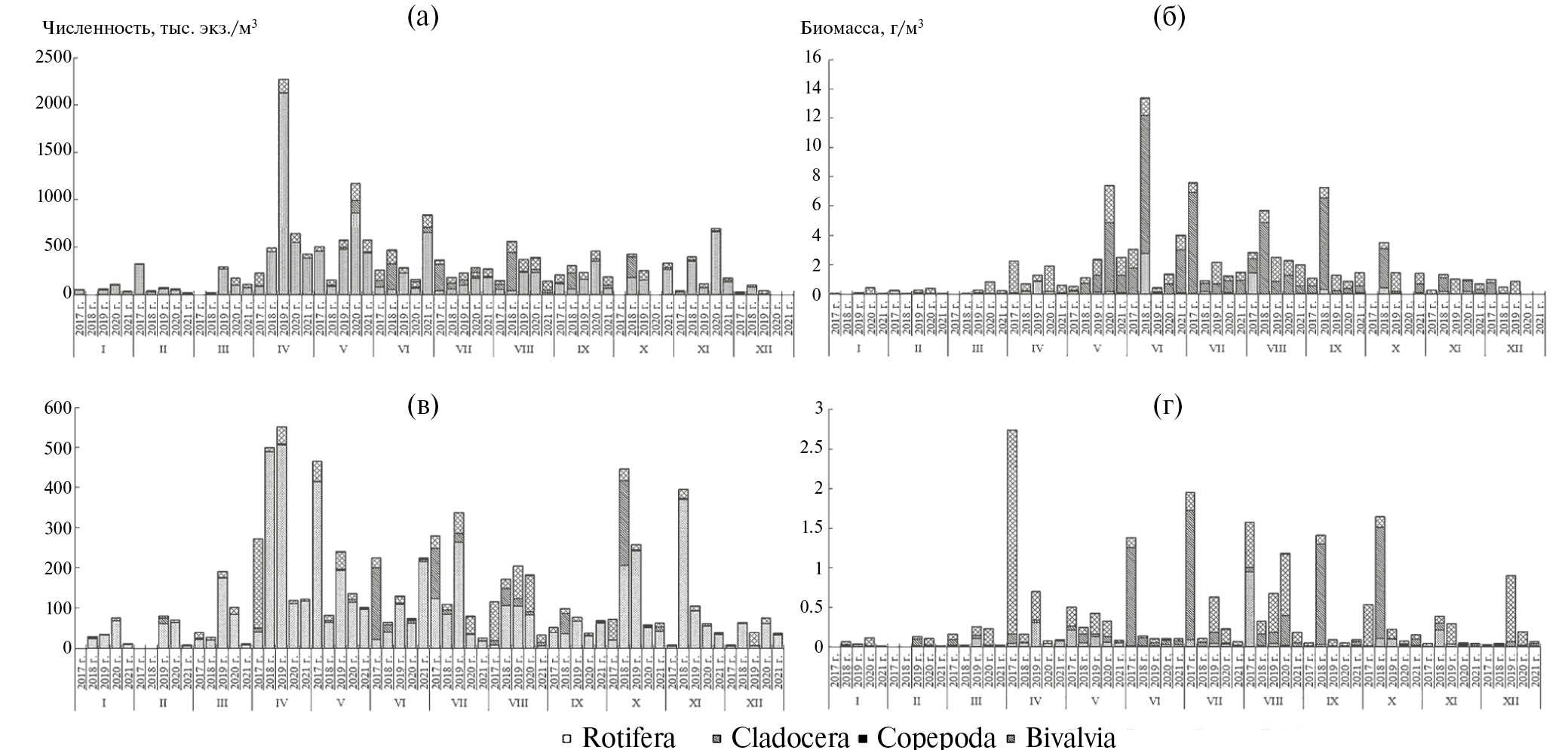 Рис. 7. Сезонная динамика численности (а, в) и биомассы (б, г) зоопланктона на ст. НЭБ-1 (а, б) и станции НЭБ-2 (в, г) в 2017–2021 гг.