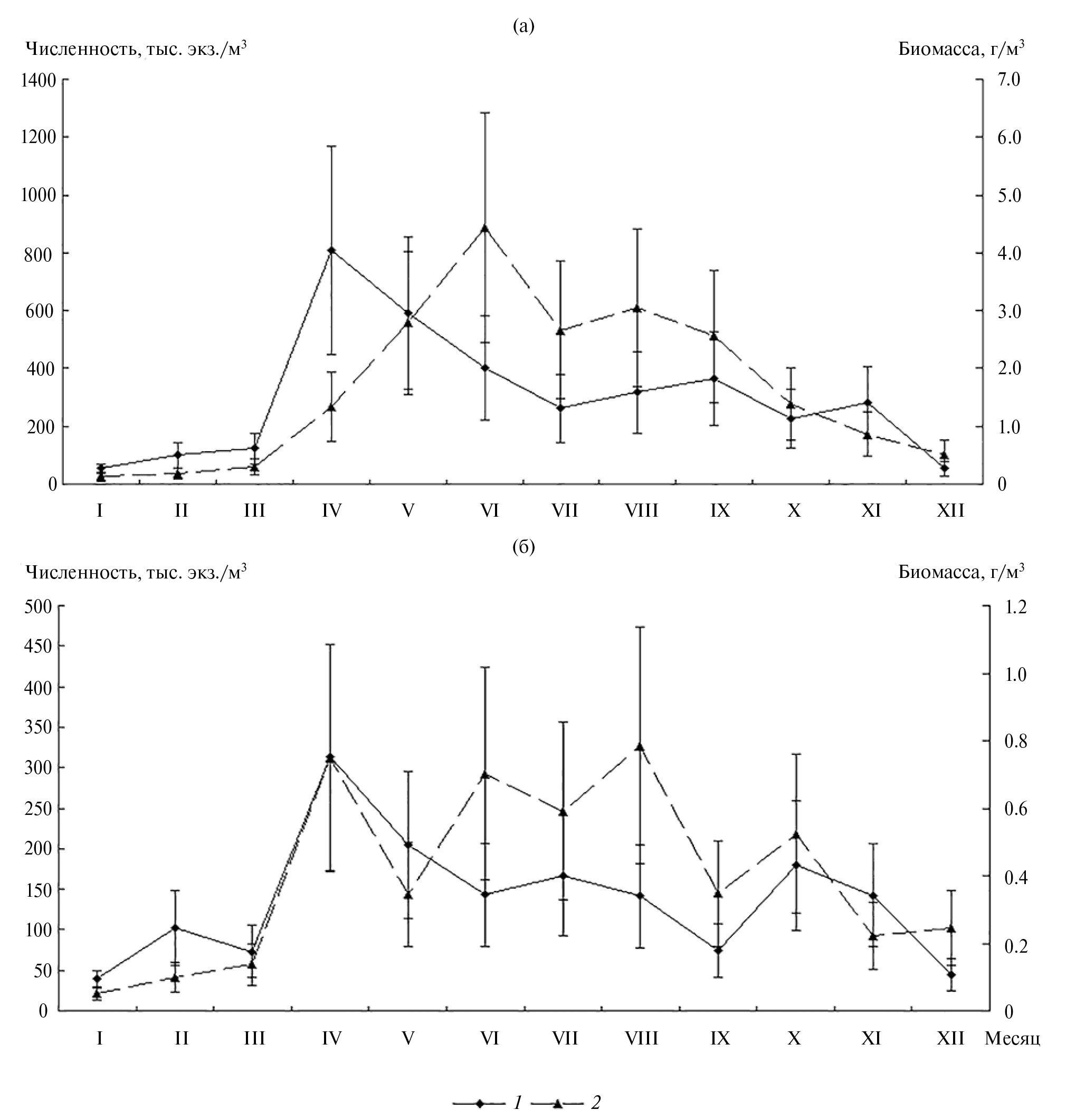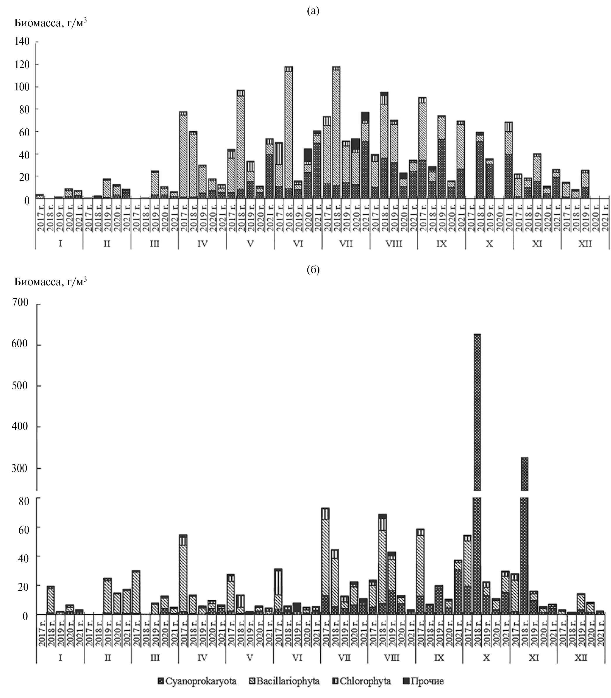 Рис. 3. Сезонная динамика биомассы фитопланктона на станциях НЭБ-1 (а) и НЭБ-2 (б) в 2017–2021 гг. I–XII — месяцы.