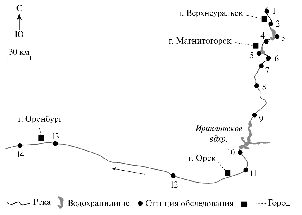 Материал собирали в межень 16–24 августа 2022 г. в пределах российской части бассейна р. Урал (рис. 1, табл. 1). Ширина реки в местах сбора изменялась от 15–20 м в районе г. Верхнеуральск до 100 м ниже г. Оренбург (у пос. Шуваловка). Скорость течения — от 0.1 м/с до 0.6 м/c (в среднем 0.3 м/с). Донные отложения, преимущественно, гравийно-галечно-песчаные. Обследование проводили при одинаковых гидрометеорологических условиях, характеризующихся теплой погодой и отсутствием осадков. Температура воды была в пределах 19–25°C (в разное время суток); ниже Ириклинского водохранилища — 15°C (влияние донного водоспуска).