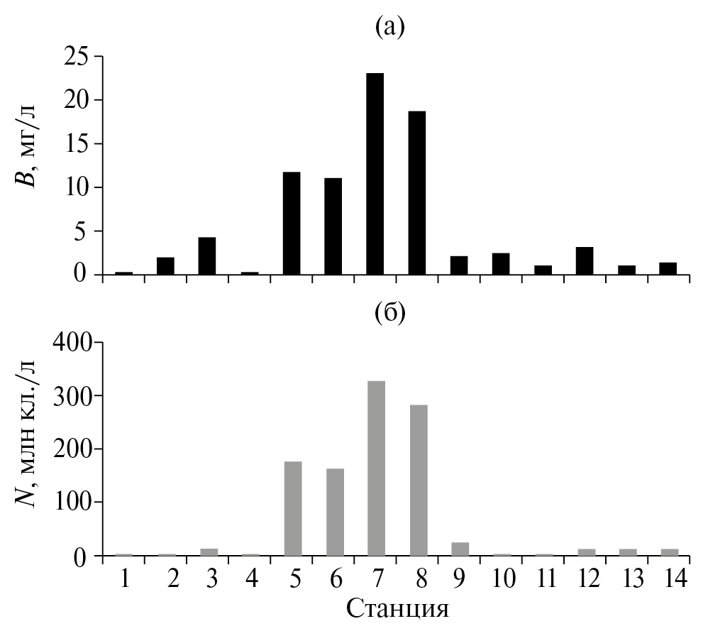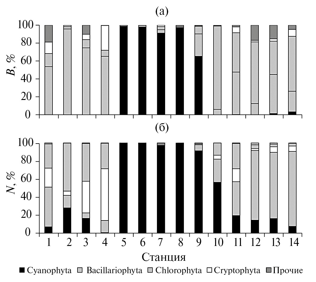 Наиболее выраженное развитие микроводорослей зарегистрировано в верхнем бьефе Магнитогорского вдхр. (особенно в его приплотинной части) и на участке протяженностью ~150 км ниже по течению реки (рис. 2), где биомасса фитопланктона изменялась от 10.9 мг/л на ст. 6 (в 1.5 км ниже плотины Магнитогорского вдхр.) до 23 мг/л на ст. 7 (у пос. Янгельский). Полученные значения соответствуют гипертрофному состоянию водных объектов, что неблагоприятным образом сказывается на качестве воды и условиях существования водных организмов. Анализ соотношения основных групп водорослей показал, что на рассматриваемом участке реки цветение вызвано цианобактериями, среди которых доминирует один вид — Microcystis aeruginosa (рис. 3).