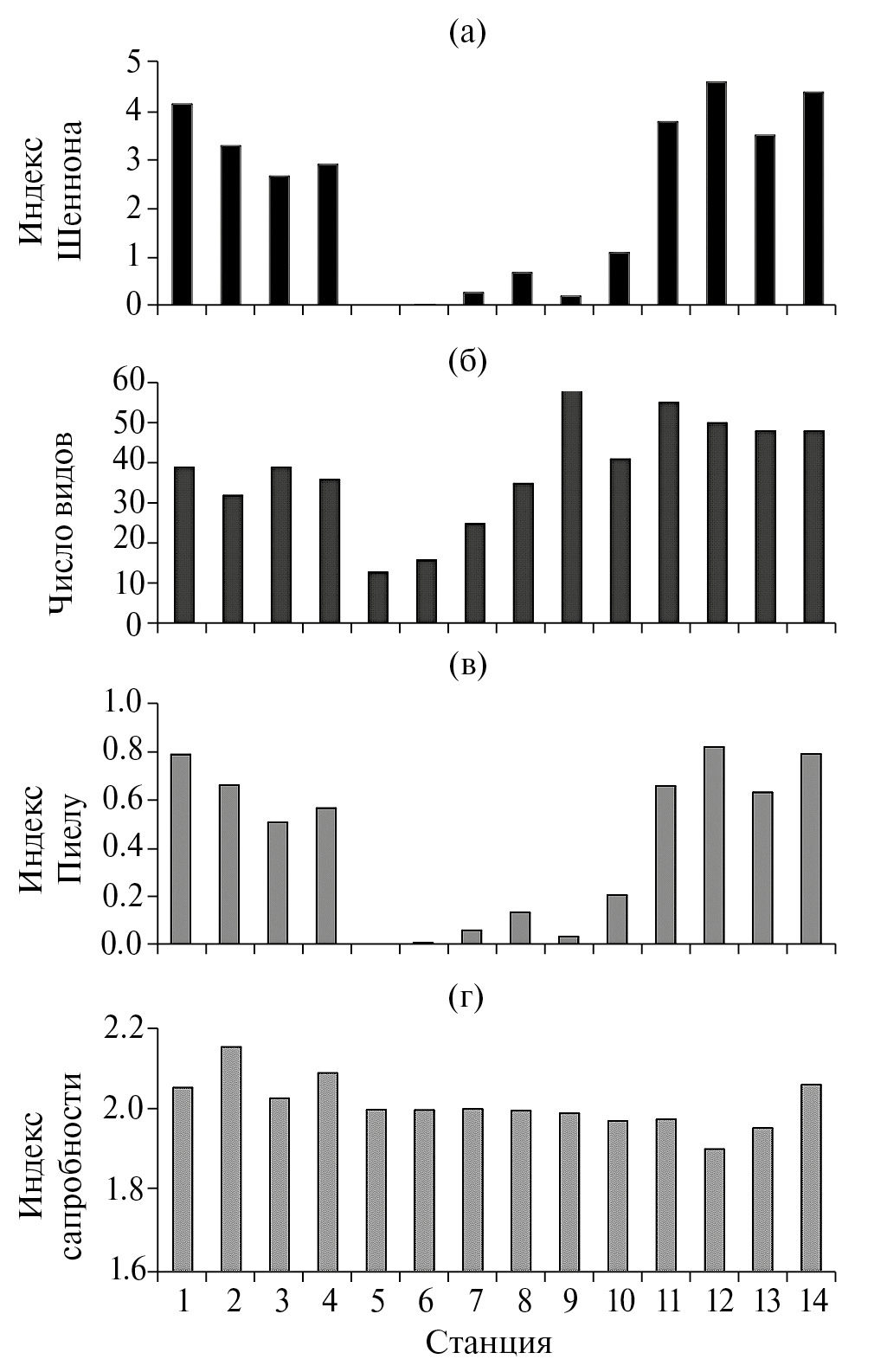 Все полученные значения индексов сапробности (рис.4г) укладываются в рамки одной зоны сапробности (1.5–2.5) – характеризуя водные объекты, как умеренно загрязненные. Это можно рассматривать как свидетельство того, что источников бытовых сточных вод здесь немного, а те, что есть, проходят очистку.