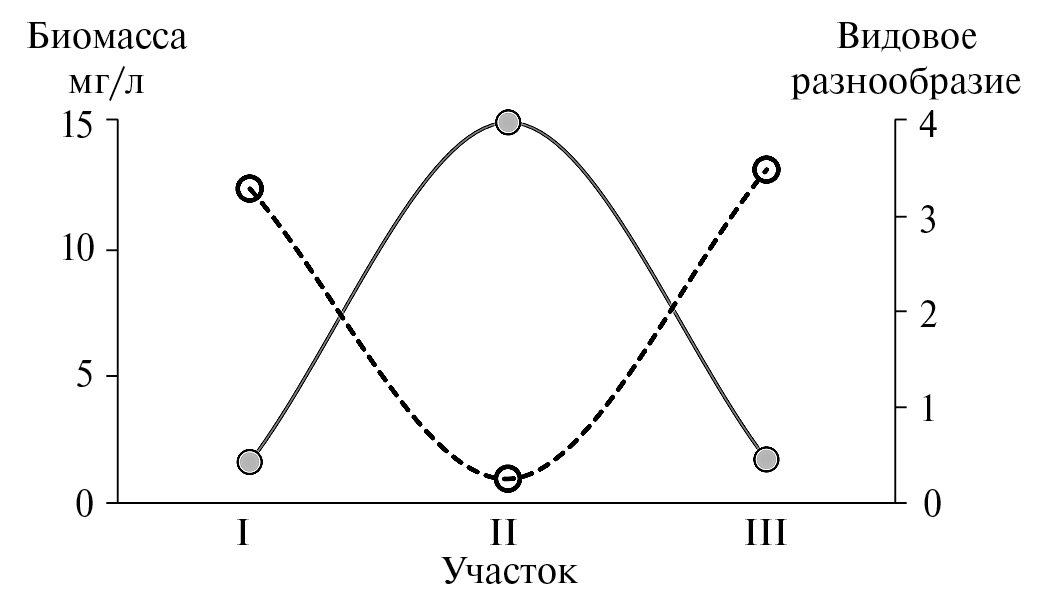 Для выделенных участков получены средние значения основных показателей — биомассы и видового разнообразия фитопланктона. Представленные на рис. 5 результаты отражают основную особенность изменения фитопланктона по длине р. Урал — в средней части на расстоянии >150 км распространяется мощное эвтрофирующее воздействие г. Магнитогорска. Ярко проявляется известная экологическая закономерность, что при эвтрофировании водных объектов биомасса в них возрастает, а видовое разнообразие снижается (Алимов, 2000, Begon et al., 1986).