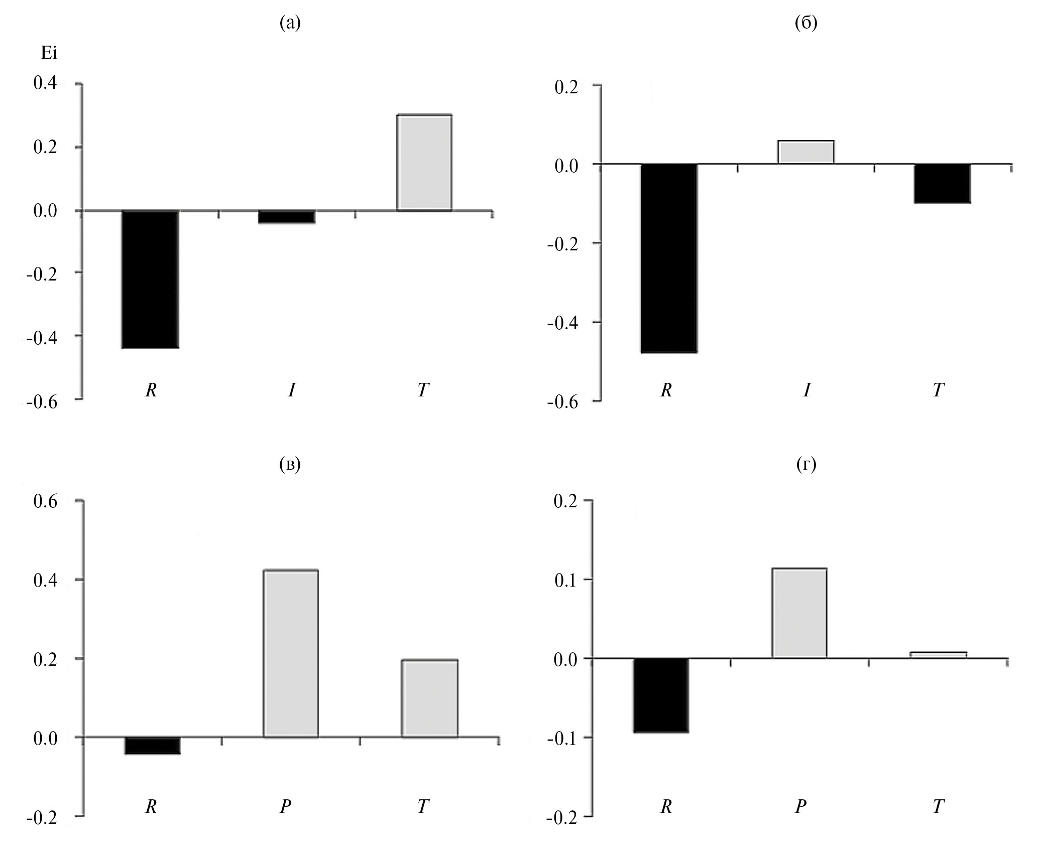 Рис. 6. Индексы элективности (Ei ) клеток микроводорослей из трехкомпонентных смесей TRI (а, в) и TRP (б, г) в 1-е сут эксперимента (а, б) и за 3 сут совокупно (в, г).