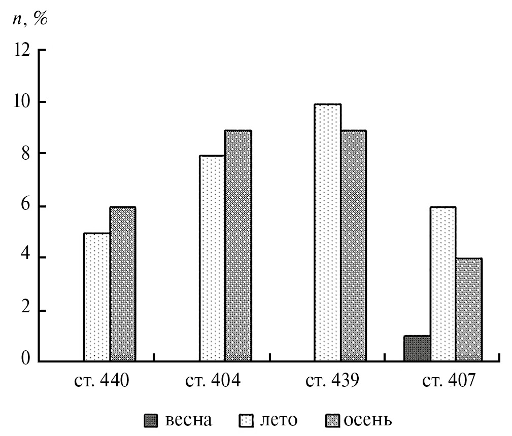 На станциях, расположенных в центральной части Куршской косы, микроцистины наиболее часто отмечены в летний сезон, осенью — реже. На станциях в кутовой части залива микроцистины, наоборот, чаще отмечены в осенний сезон, реже — летом. Весной микроцистины обнаружены только однажды, на станции, распложенной в центральной части косы (рис. 4).