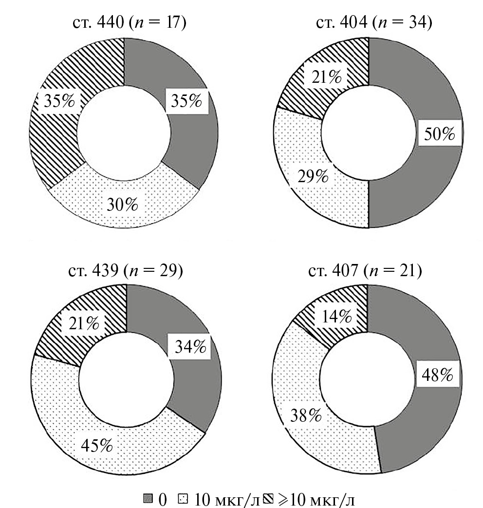 Содержание микроцистинов на уровне ≥10 мкг/л наиболее часто отмечено в кутовой части залива на ст. 440 (35% измерений на станции), реже всего — на ст. 407 (14%), расположенной в литорали средней части косы, в центральном гидрологическом районе (рис. 3). Наиболее часто (~50%), микроцистины отсутствовали на станциях 404 и 407. На станциях 440 и 439 только 1/3 проб была нетоксичной.