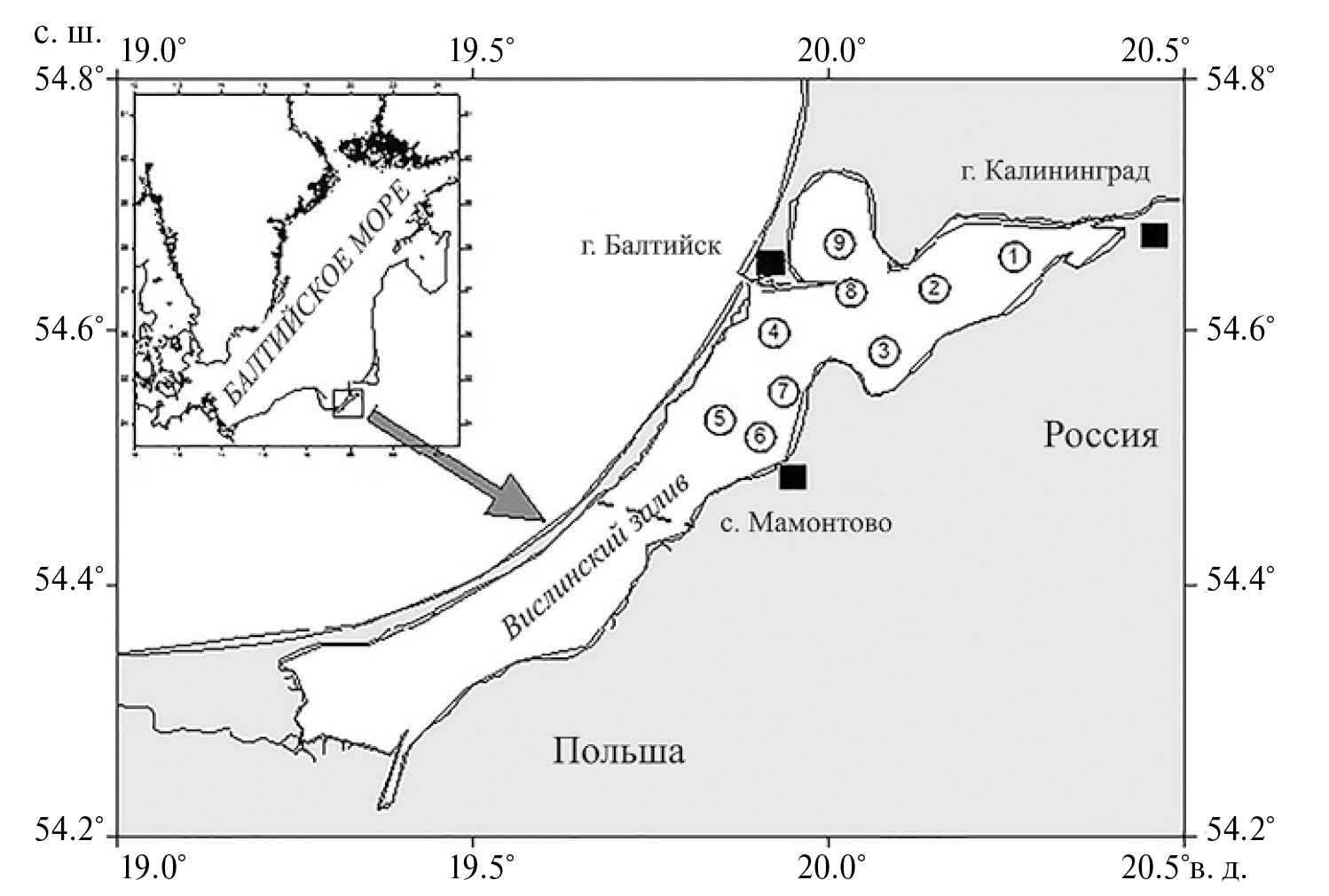 Рис. 1. Район исследований и расположение станций отбора проб зоопланктона (1–9) в Вислинском заливе.
