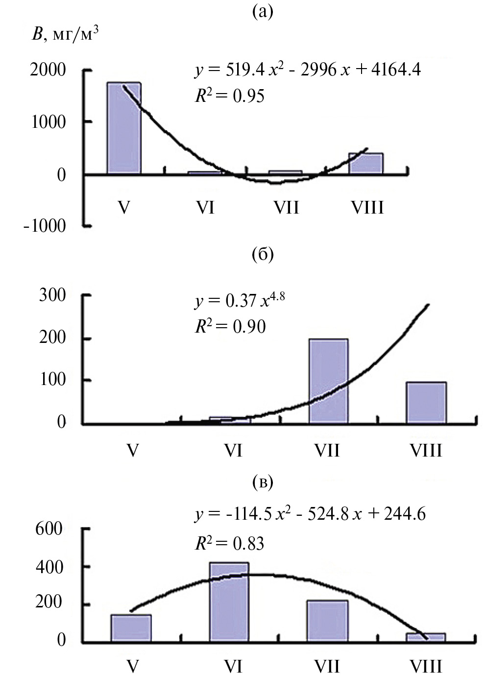 Рис. 3. Среднемноголетняя сезонная динамика биомассы (В) доминирующих видов ракообразных в Вислинском заливе: a ‒ Eurytemora affinis; б ‒ Acartia tonsa; в ‒ Cercopagis pengoi.
