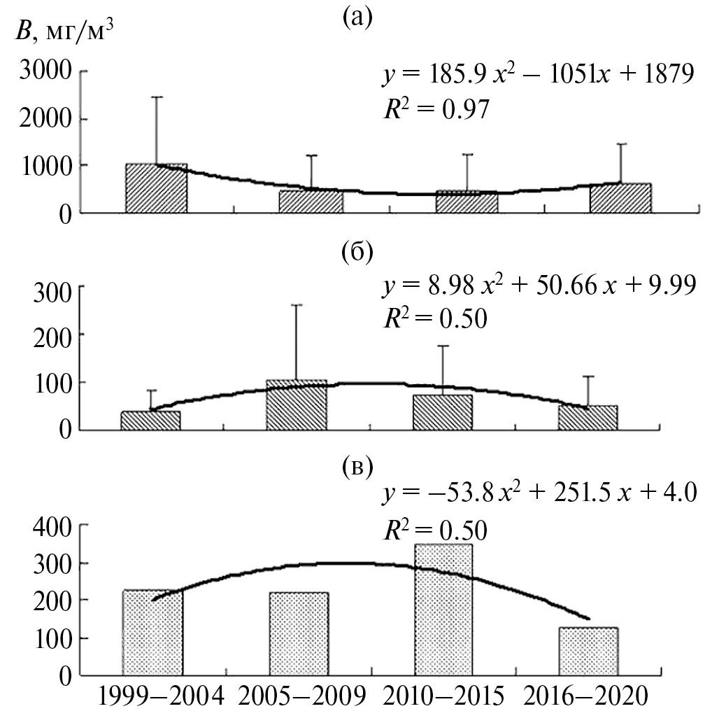 Сравнительный анализ средних значений численности, биомассы и продуктивности выбранных групп зоопланктона проводили с использованием множественного сравнения Тьюки при уровне значимости p <0.05. В тех случаях, когда различия между средними значениями были существенными (p <0.05), т.е. при наличии тренда, для количественного описания этих трендов использовали модели нелинейной регрессии. Адекватность модели оценивали с помощью R2. Для того чтобы убрать “шумы”, при анализе материал разделяли на временные периоды: 1999–2004, 2005–2009 гг. (вселение и натурализация Cercopagis pengoi), 2010–2015 и 2016–2020 гг. Для статистического анализа использовали пакет программ Statistica v. 7 и языка R в R-Studio 1.0.44.