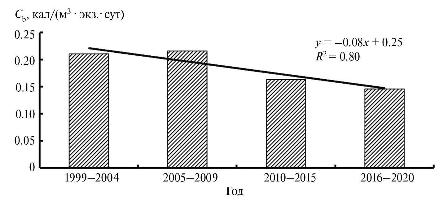 Анализ многолетних данных позволил выявить тенденцию к снижению численности и биомассы коловраток и кладоцер в зоопланктоне Вислинского залива. У веслоногих ракообразных также в целом наблюдали долгосрочную тенденцию к снижению количественного развития (рис. 4, 5). Биомасса Eurytemora affinis после длительного достоверного снижения в последний период (2016–2020 гг.) показала тенденцию к росту (рис. 6а) на фоне сокращения биомассы вселенца Cеrcopagis pengoi (рис. 6в). Долгосрочная динамика биомассы Aсartia tonsa отражала обратную тенденцию и демонстрировала пологий куполообразный тренд с уменьшением биомассы в течение последнего десятилетия (рис. 6б). Удельная скорость продукции Eurytemora affinis закономерно снижалась (рис. 7).