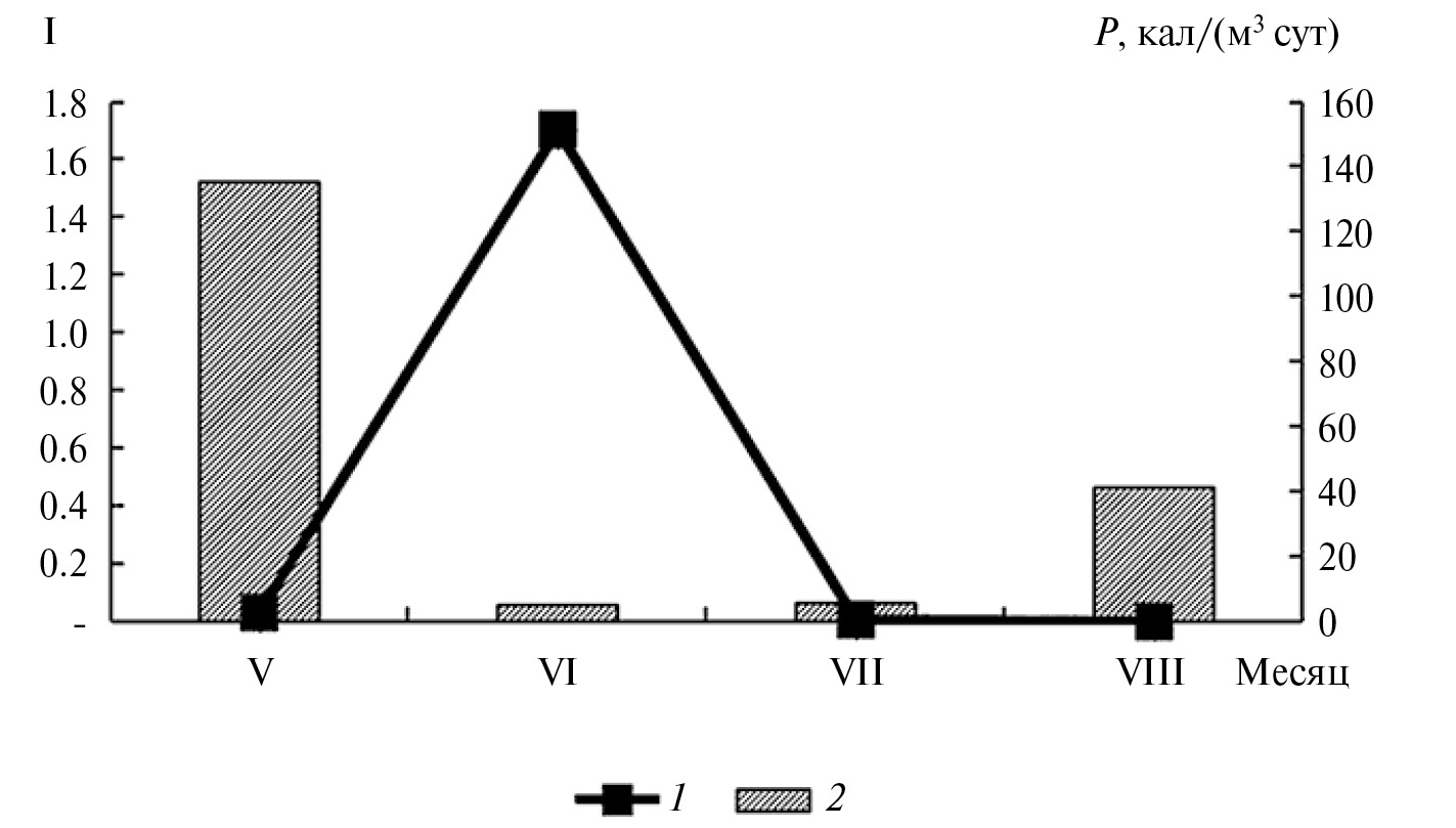 Влияние пресса хищников Cеrcopagis pengoi на зоопланктон оценивали по Импакт-индексу во время максимального развития популяции этих рачков. Значения Импакт-индекса отрицательно коррелировали со среднемесячной суточной продуктивностью наиболее массовых копепод (Eurytemora affinis) в те же месяцы. Максимальные значения воздействия хищного планктонного вселенца обычно регистрировали в июне (рис. 8). В последующие месяцы — в июле и августе, т.е. после наивысшего пресса Cеrcopagis pengoi на зоопланктон, продукция Eurytemora affinis существенно снижалась (рис. 8). Этот результат позволил сделать вывод, что науплии и копеподиты младших стадий E. affinis служили предпочтительной пищей для церкопагиса в Вислинском заливе.