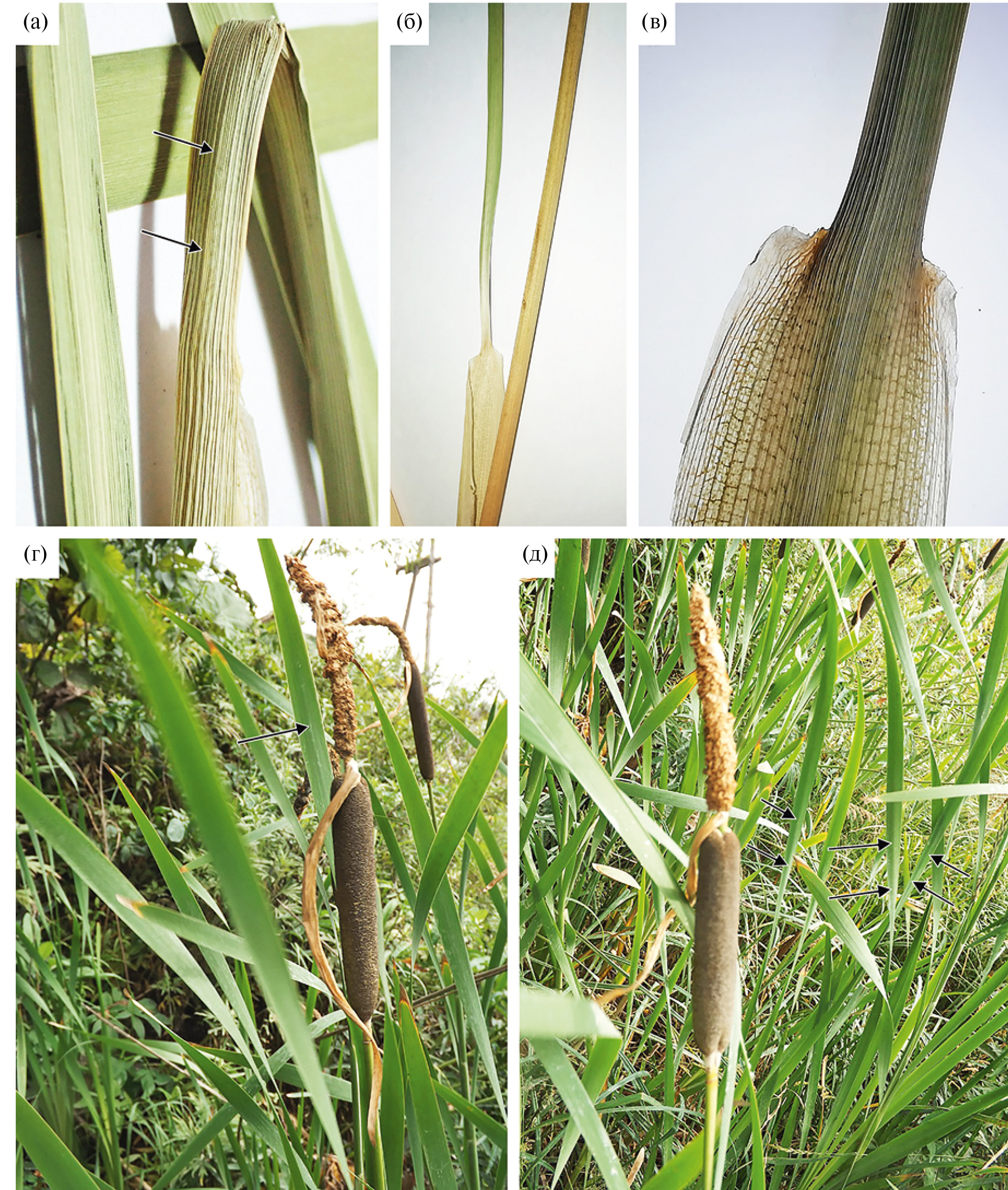 Рис. 2. Особенности строения листьев Typha japonica: а — сглаженный киль на абаксиальной стороне в нижней части листовой пластинки; б — сужение листовой пластинки в месте ее перехода в листовое влагалище (адаксиальная поверхность); в — влагалищно-пластиночное сочленение (абаксиальная поверхность) (фото О.А. Капитоновой); г, д — общий вид растений Typha japonica, о. Сахалин (фото А.Н. Ефремова, 22.08.2019, https://www.inaturalist.org/observations/40890835). На рисунках (а), (г) и (д) стрелки указывают на сглаженный киль.