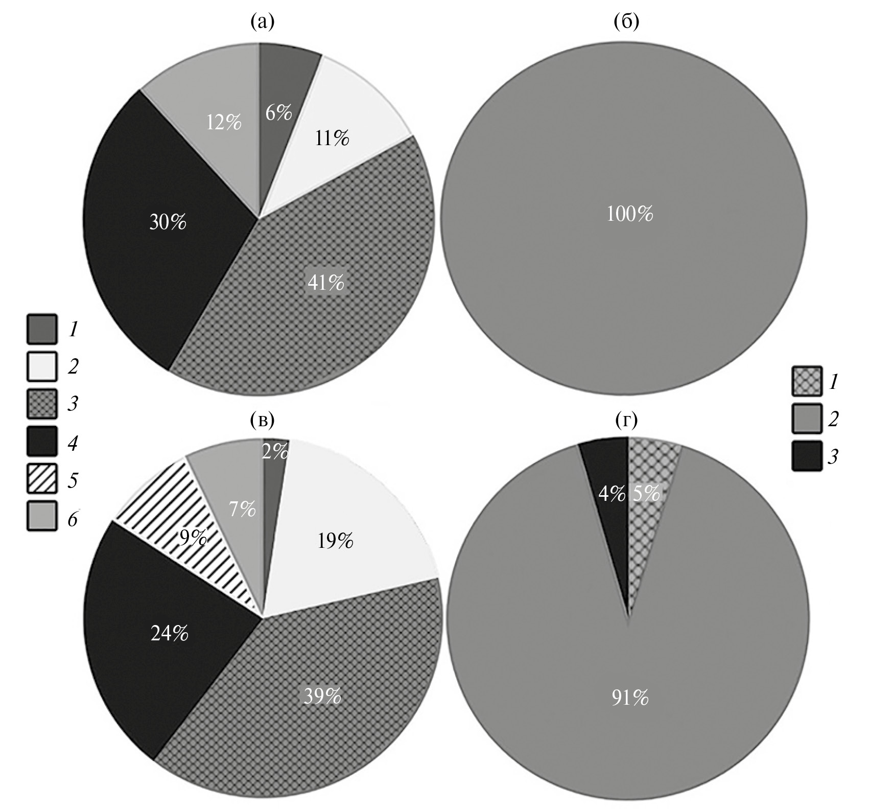 2. Рис. 1. Распределение частиц микропластика по размеру: 1 – 0.15–0.30; 2 – 0.31–1.00; 3 – 1.01–2.00; 4 –2.01–3.00; 5 – 3.01–4.00; 6 – 4.01–5.00 (а, в) и форме: 1– пленки; 2 – волокна; 3 – фрагменты (б, г) в ЖКТ исследованных особей Abramis brama (а, б) и Perca fluviatilis (в, г).