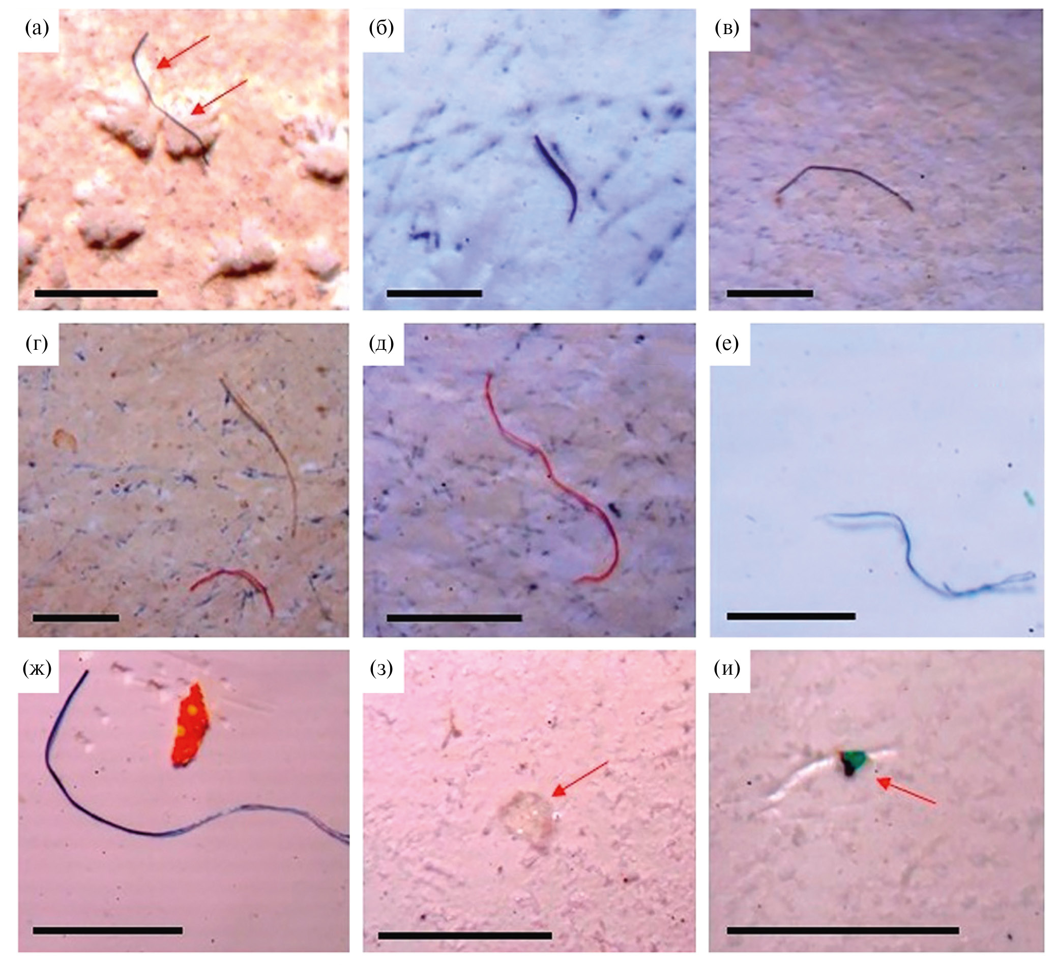 3. Рис. 2. Частицы микропластика, найденные в ЖКТ Abramis brama (а–в, е) и Perca fluviatilis (г, д, ж–и). Масштабная линейка равна 1 мм.