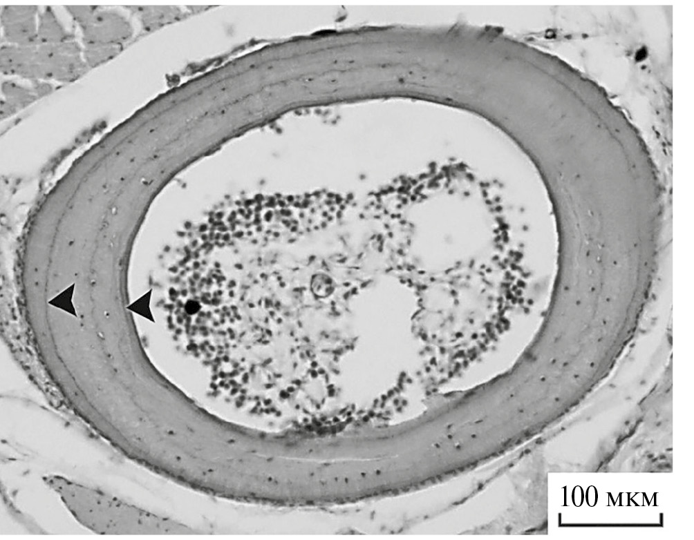 В камеральных условиях для оценки возраста особей сибирской лягушки использовали поперечные срезы третьей фаланги четвертого пальца левой задней конечности, зафиксированной в 10%-ном формалине. Костные образцы декальцинировали в 5%-ной азотной кислоте. Время декальцинации устанавливали экспериментально (Смирина, 1989). Затем проводили классическую гистологическую обработку с заключением в парафин (Exbrayat, 2013). Для нарезки гистологических образцов использовали полуавтоматический ротационный микротом (MtPoint, модель RMD — 3000, Россия). Срезы монтировали на стекла с белок-глицериновым покрытием. Окрашивание проводили гематоксилином Карацци. Всего изготовлен 81 микропрепарат. Для микроскопии и изготовления микрофотоснимков применяли микроскоп AxioLab.A1 с камерой AxioCam ERc5s и программное обеспечение ZEN 2011 (Carl Zeiss Microscopy, Германия). При определении возраста использовали число видимых линий остановки роста (линий склеивания) и степень сохранности первой линии склеивания (рис. 1). Последнее оценивали по доле оставшегося участка линии на срезе (Hemelaar, 1985). Минимальное количество пережитых зимовок обозначали цифрой со знаком “+”, на самом деле их могло быть больше, поскольку часть линий склеивания могла подвергнуться резорбции.