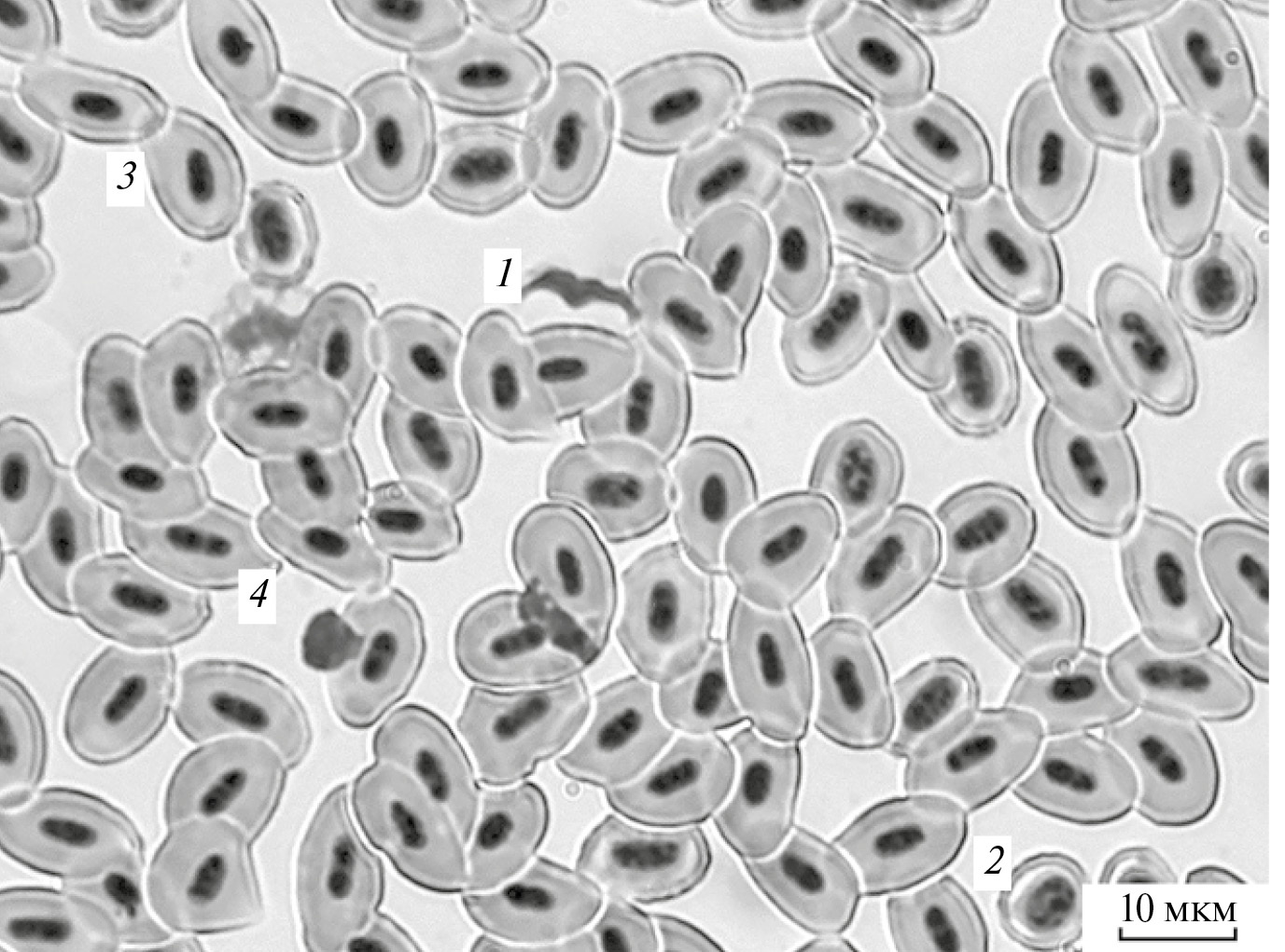 Материал для исследования отлавливали мальковым тралом в августе 2019 г. в Иваньковском водохранилище в ходе рейса научно-исследовательского судна “Академик Топчиев”. Для исследования отбирали рыб (20 экз.) в возрасте 1+, 2+ длиной 47‒58 мм и массой 1.1‒2.4 г. Для исследования клеток приготавливали мазки периферической крови. Высушенные на воздухе мазки фиксировали этиловым спиртом и окрашивали краской Романовского–Гимза на фосфатном буфере при pH 7.0. Мазки просматривали под цифровым микроскопом Keyence VHX-1000 с объективом Z-500 и встроенной программой морфометрического анализа. Определяли индекс обилия лейкоцитов, состав лейкоцитов и тромбоцитов, состав эритроцитов и наличие патологических форм эритроцитов, при морфометрии эритроцитов рассчитывали площадь клеток и их ядер, ядерно-цитоплазматическое отношение (ЯЦО), индекс формы клеток (If). Подробно методы исследования лейкоцитов и тромбоцитов описаны ранее (Трофимов и др., 2022). Соотношение различных форм эритроцитов и амитозы рассчитывали как доли при просмотре 500 клеток (%), микроядра ‒ 1000 клеток (‰). Для морфометрических исследований на каждом мазке измеряли по 100 зрелых эритроцитов. Индекс формы эритроцитов рассчитывали как отношение малого и большого диаметра клетки (усл. ед.).