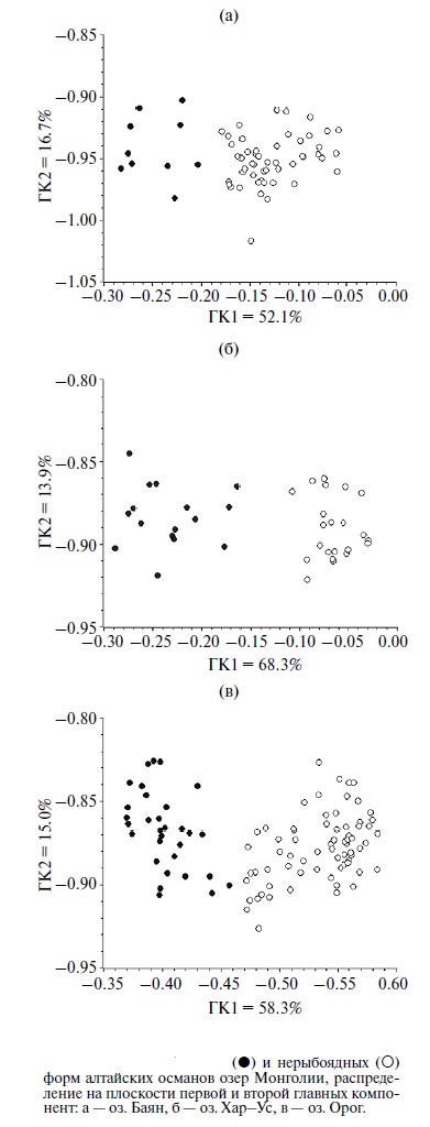 Таким образом, в озерах Тана, Баян и Хар-Ус выявленная структура различий характеризует уже устоявшуюся ситуацию стационарного сосуществования рыбоядных и нерыбоядных форм в одном водоеме. Структура различий в оз. Орог отражает не стационарную ситуацию, но незавершенный процесс еe формирования, раз за разом прерываемый гибелью популяции озера в очередной сухой период. Следует отметить, что у рыб оз. Орог векторные нагрузки параметров жаберной крышки Op и Pop имеют знак “–”, что сближает их с османами озер Баян и Хар-Ус, отличая в совокупности от усачей оз. Тана.