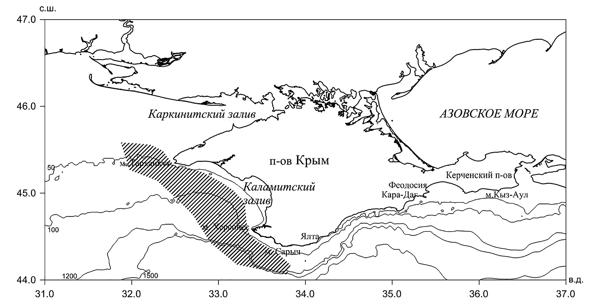 Рис. 1. Карта-схема Черного моря (п-ов Крым), штриховкой дан район исследования.