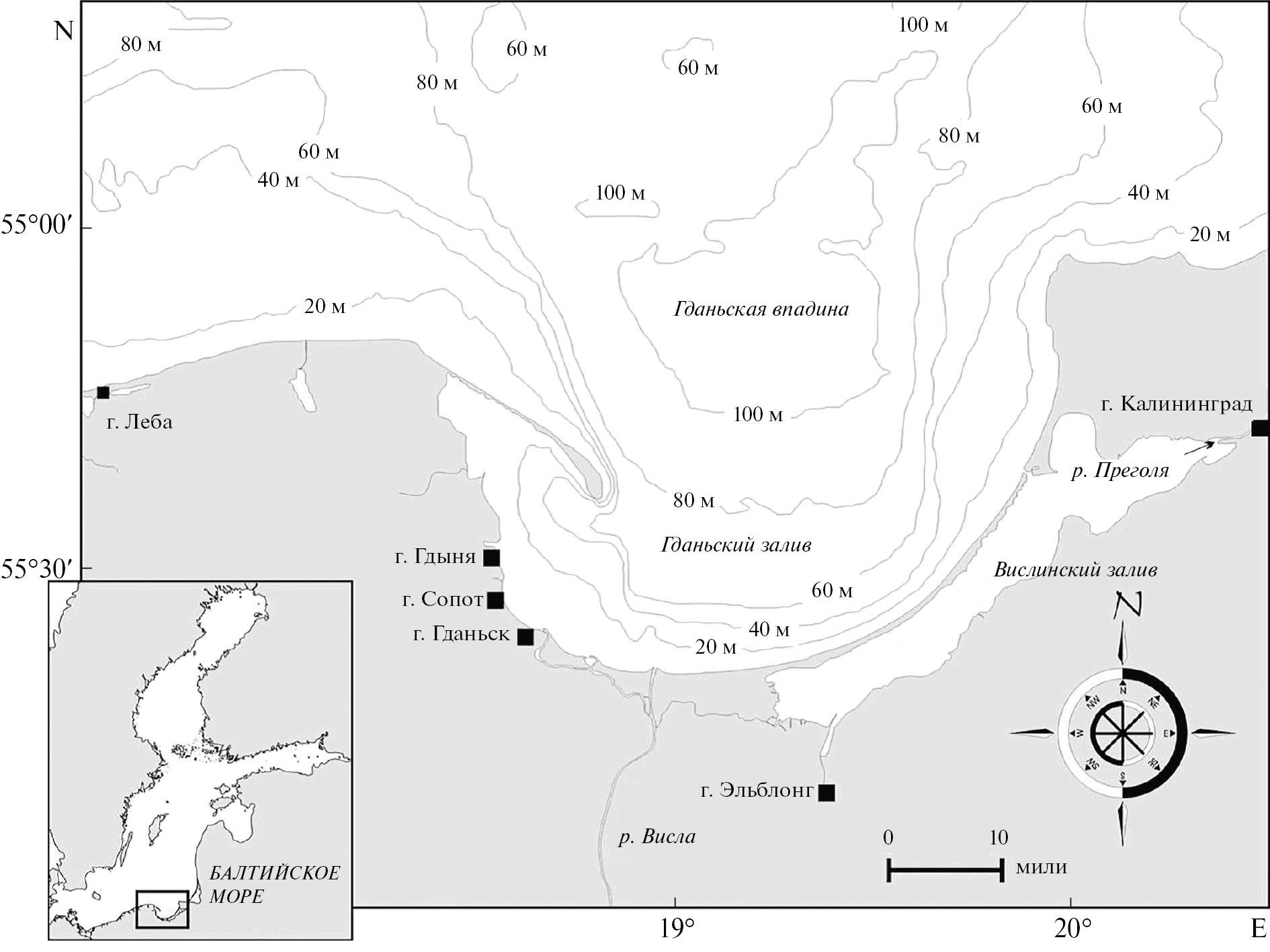 ВЗ расположен в юго-восточной части побережья Балтийского моря в глубине Гданьского залива (рис. 1). Залив представляет собой узкую, вытянутую вдоль берега лагуну. По геоморфологическим и гидрологическим признакам ВЗ можно отнести к лагунным экосистемам “полуоткрытого” типа (Науменко, 2007; Александров, 2010), или, по другой классификации, к эстуариям морского типа (Михайлов, Горин, 2012). Площадь водного зеркала российской части акватории залива ~473 км2 (~56%), суммарная площадь 838 км2 (Гидрометеорологический…, 1971; Transboundary…, 2008). Объем котловины ВЗ ~2.3 км3, максимальная глубина 5.2 м, средняя – 2.7 м. От Гданьского залива Балтийского моря ВЗ отделен песчаной косой и соединяется с ним узким Балтийским проливом шириной 400 м и глубиной 8–12 м. Несмотря на свои небольшие размеры, пролив играет существенную роль в формировании структуры течений, водного и солевого баланса ВЗ, процессах обмена биогенными веществами между Вислинским и Гданьским заливами (Chubarenko, Margoński, 2008; Transboundary…, 2008; Witek et al., 2010).