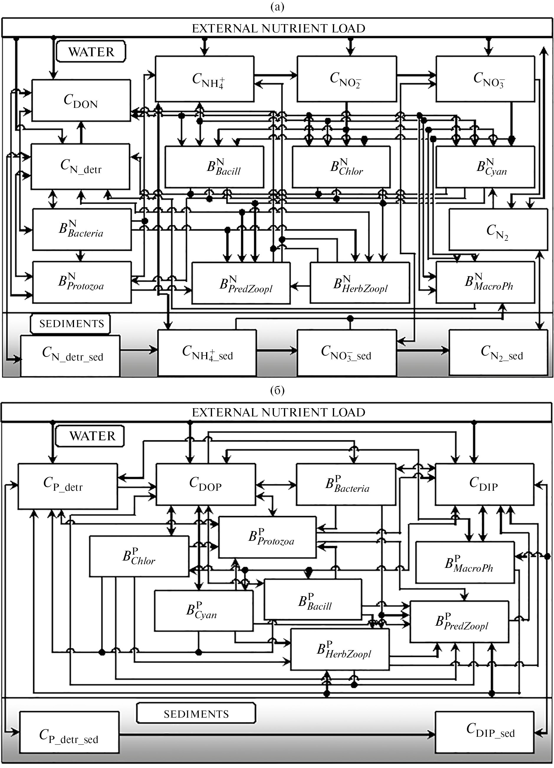 Структуры циклов азота и фосфора в планктонном блоке модели показаны на рис. 2. На этих схемах символами Ci обозначены концентрации (мг/л) рассматриваемых в модели соединений биогенных элементов. Символами B ji обозначены биомассы (мг/л). В этом представлении индекс i задает сокращенное название биотических компонентов модели, а индекс j определяет, в единицах какого биогенного элемента (N или P) выражена их биомасса.