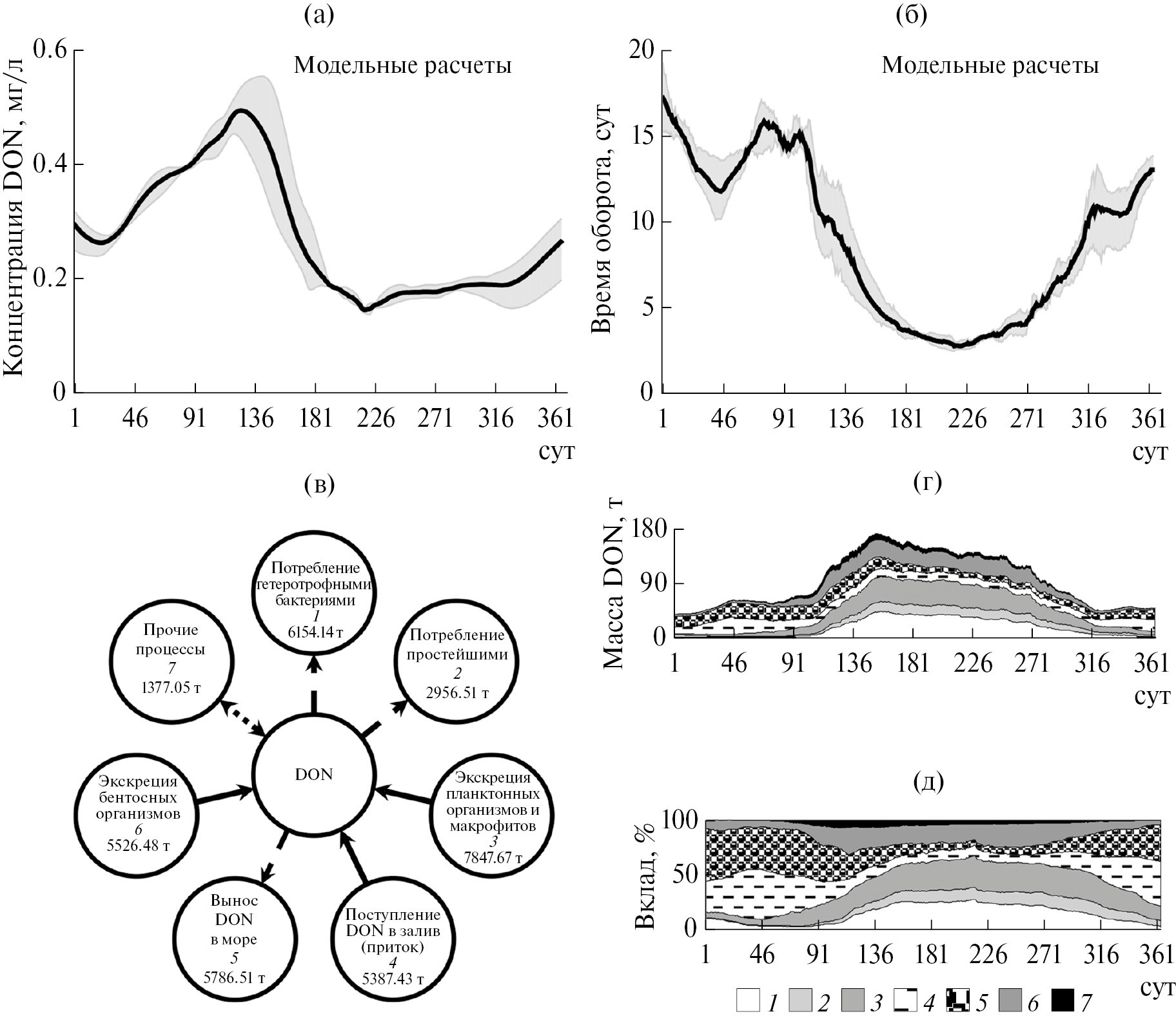 Количественная оценка значений времени оборота DON позволяет оценить интенсивность круговорота DON в экосистеме ВЗ. Данные моделирования показали, что в промежутке 1–120 сут среднее время оборота DON достигает ~14 сут, диапазон изменчивости – от 8 до 19 сут. На втором временном промежутке среднее время оборота снижается до 4.6 сут, минимальное значение – 2.4 сут. Это свидетельствует о существенной интенсификации биогидрохимических процессов трансформации DON. К концу года время оборота DON снова увеличивается (в среднем 9 сут), диапазон изменчивости – от 4 до 14 сут.