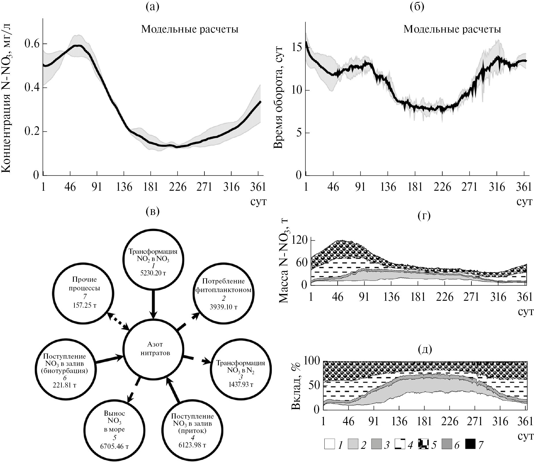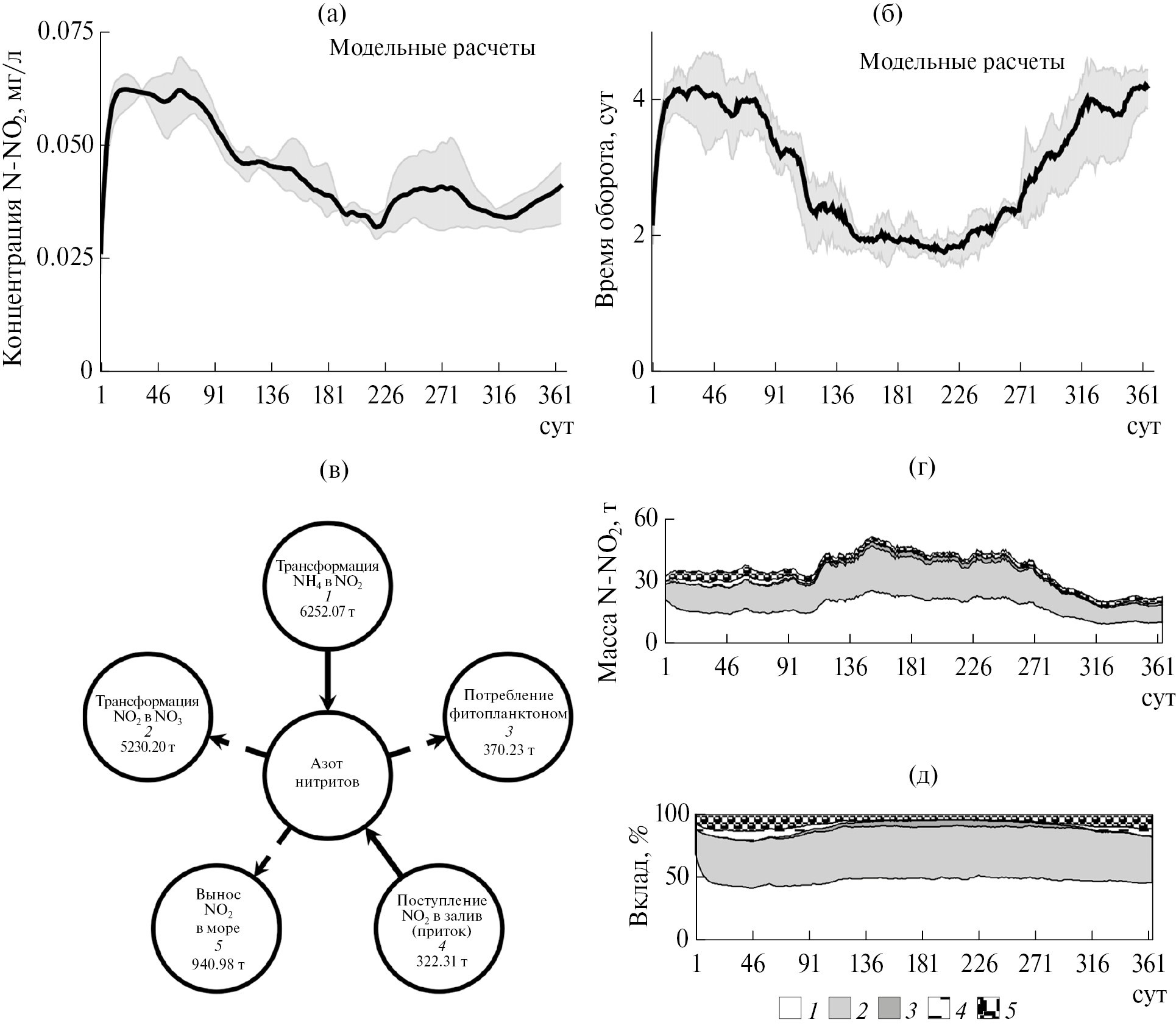 Данные моделирования показали, что среднее время оборота N – NO–2 на промежутках 1–120 и 274–365 сут достигает ~3.6 сут, в течение 121–273 сут – ~2.1 сут. Полученные значения в высокой степени сопоставимы со средним временем оборота N – NH+4 на указанных промежутках. Это свидетельствует о тесной сопряженности процессов биогидрохимической трансформации. Для выделенных временных промежутков значения коэффициентов вариации времени оборота N – NO–2 менялись от 15 до 18.7%.