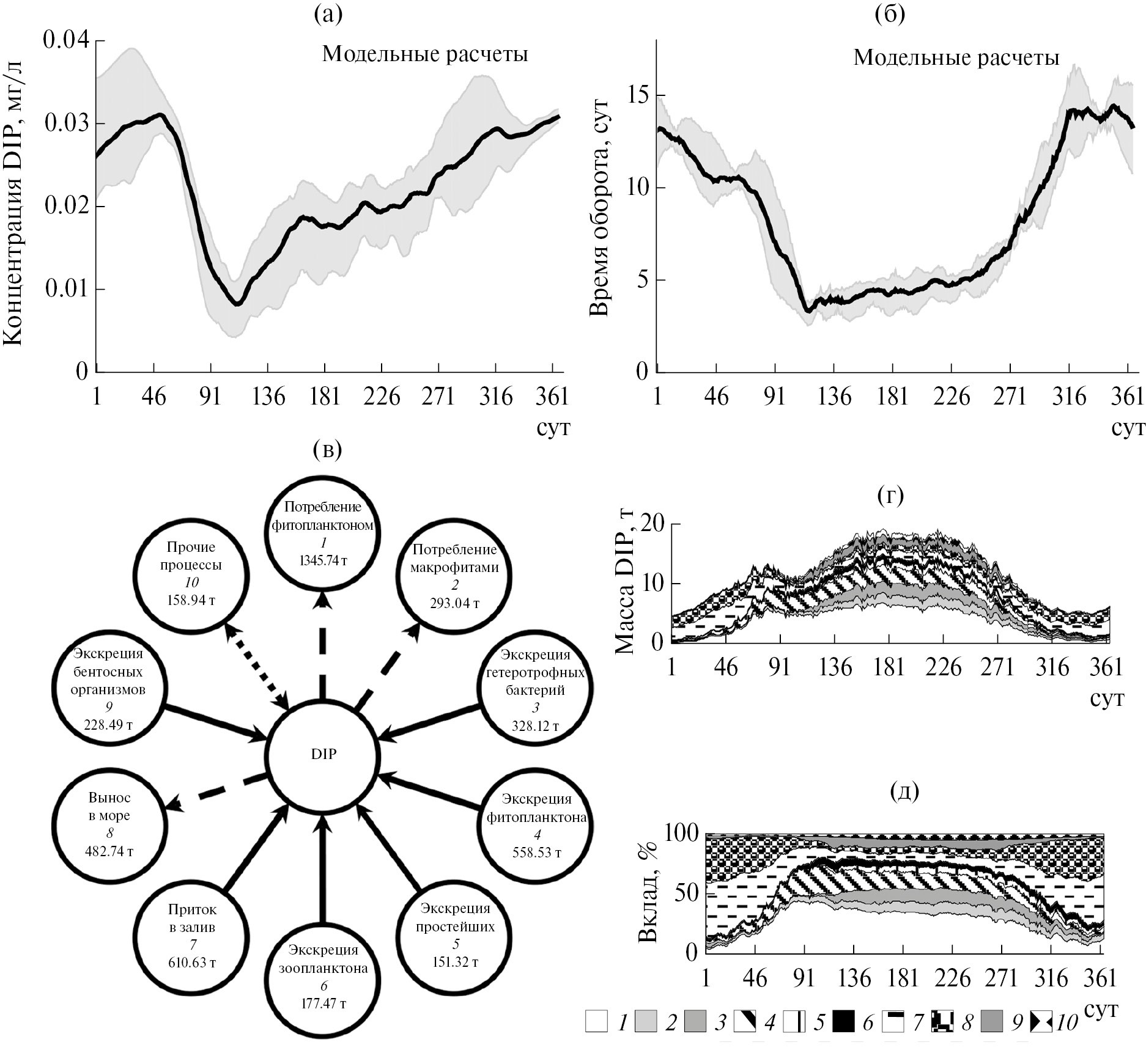 Рис. 9. Результаты моделирования внутригодовой динамики концентрации (а) растворенного неорганического фосфора (DIP), времени оборота (б) и составляющих баланса (в‒д) DIP в экосистеме ВЗ.